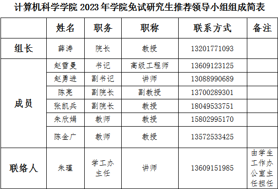根据学校2023年推荐优秀应届本科毕业生免试攻读硕士学位研究生工作的通知要求,为保证我们推荐工作的顺利实施,经学院研究决定,成立计算机科学学院2023年免试研究生推荐领导小组,名单如下表所示: