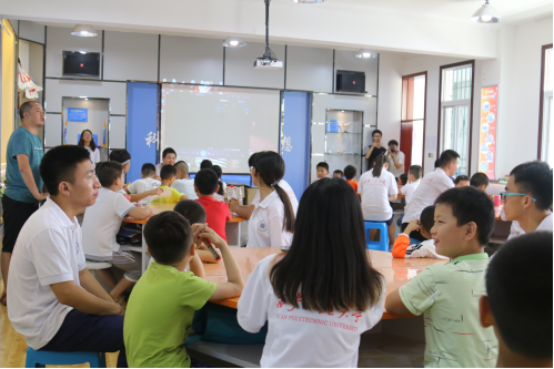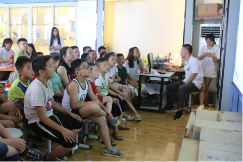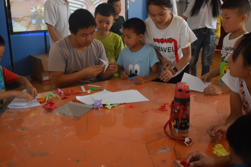 作为西乡县政府主办的青少年课外活动实践基地,该中心暑期来参加各类特长班培训的小朋友比比皆是。经过先期与中心负责人接洽,此行我们被安排到科技班,与各位小朋友进行互动。科技班的小朋友们主要学习航模、船模、机器人及手工制作等。来到教室,我们看到了孩子们所做的形式各样的手工,大家跟孩子们坐在一起,有说有笑,从开始的陌生逐渐变为了熟悉。
