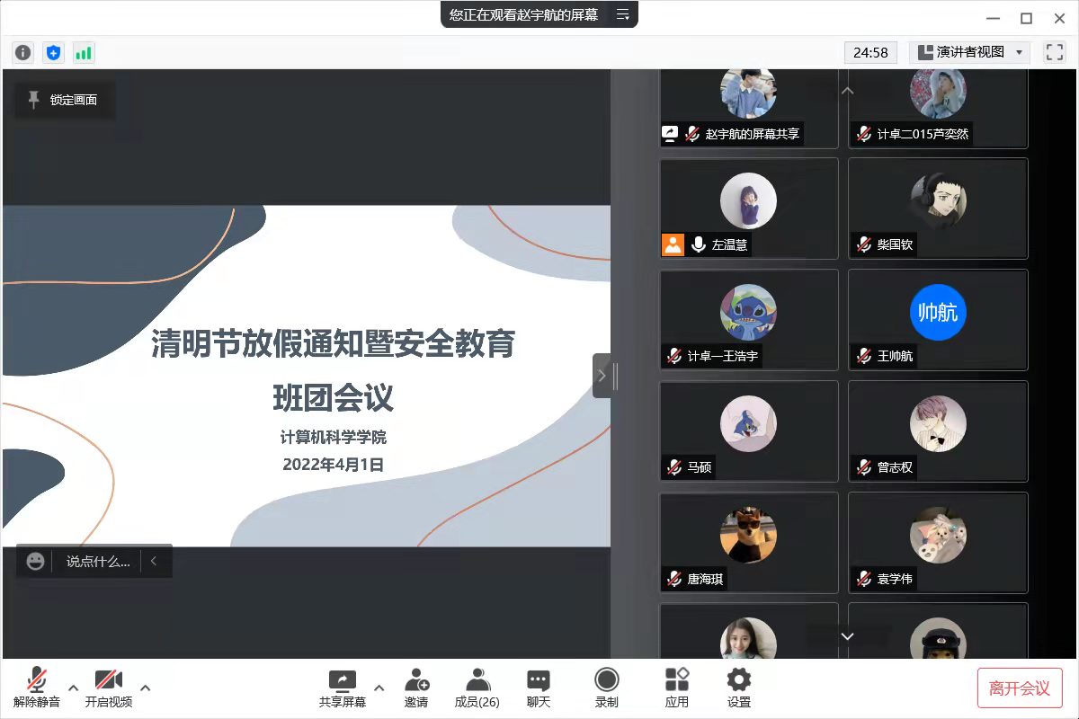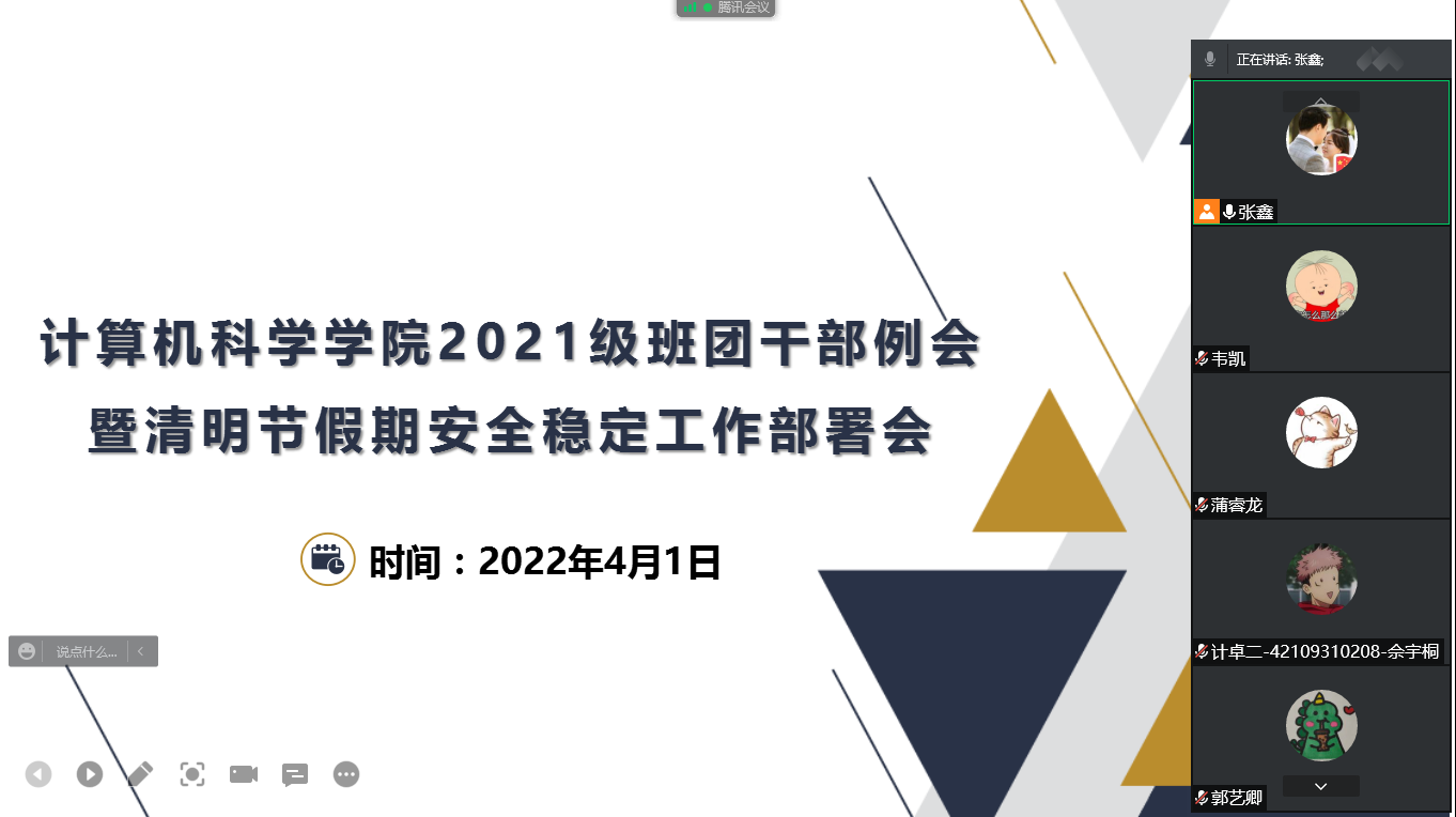 随后,各位辅导员也及时行动,组织召开线上线下会议,传达学校清明节放假及外出的相关要求。各年级各班也通过召开主题班会的形式将清明节假期的疫情防控政策和外出须知传达到每一位同学,确保大家知规矩、守规矩,安全平稳度过清明节假期。(撰稿:张鑫 审核:周波)