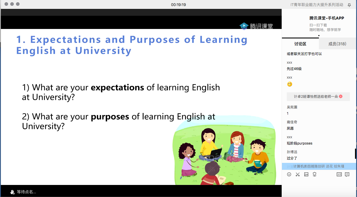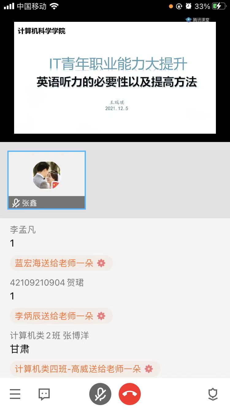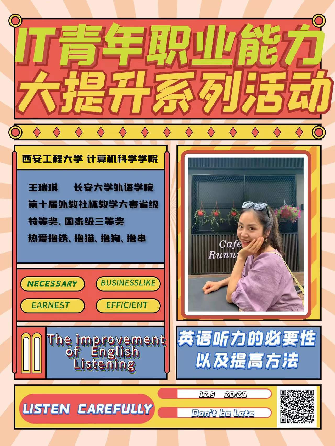 12月5日,计算机学院利用腾讯课堂平台,举行IT青年职业能力大提升系列活动之英语听力的必要性以及提高方法,长安大学外语学院王瑞琪作为本次活动的主讲人,2021级和2020级共400余名学生参加了本次线上讲座。