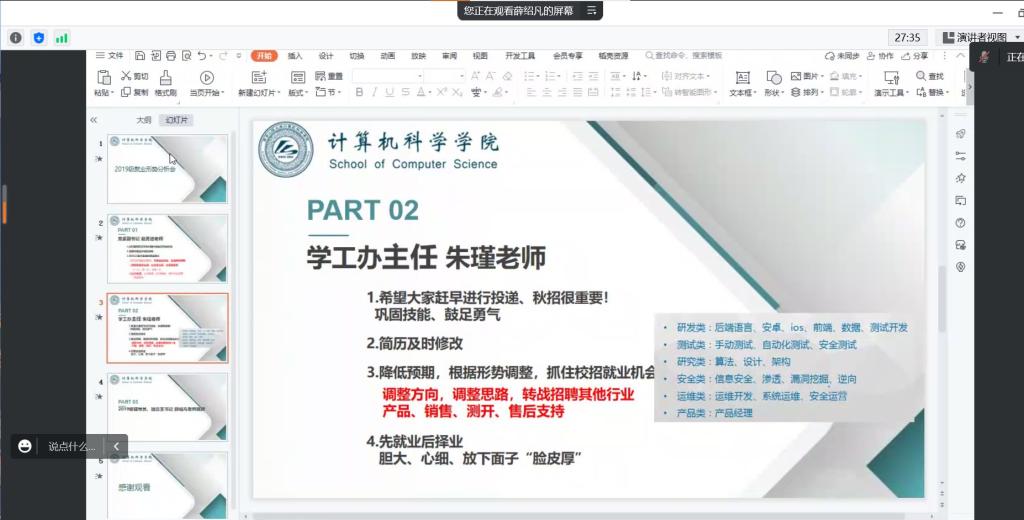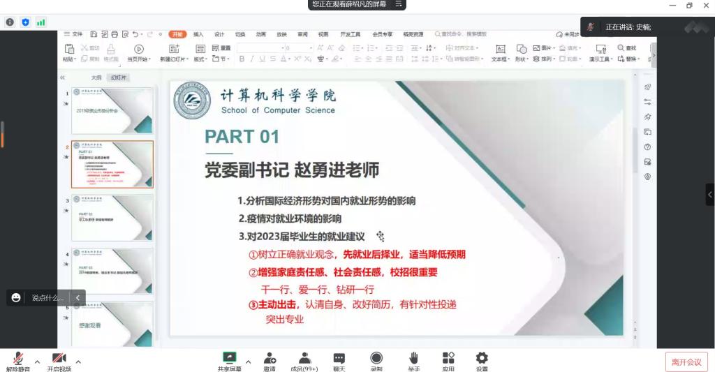 会议伊始,薛老师首先分析了近三年的就业考研情况,就业率持续下降的同时考研率大幅上升。近年来,各大互联网公司持续“人员优化”,企业不断提高门槛,本科生就业压力增加。而00后占据主导后,慢就业缓就业进一步加剧。面对当前的就业现状,我们学院制定了专门的2023届就业工作计划,助推大家顺利就业。