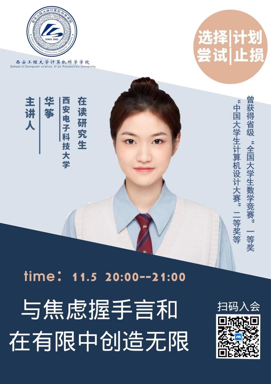 11月5日晚,9499www威尼斯组织召开了2022年“与焦虑握手言和,在有限中创造无限”宣讲会,旨在提倡我们学生克服焦虑。本次分享会邀请了2022届毕业生华筝分享自己的学习经验,并现场答疑解惑。全体辅导员参会,会议由朱成功主持,共有300余名学生参加。