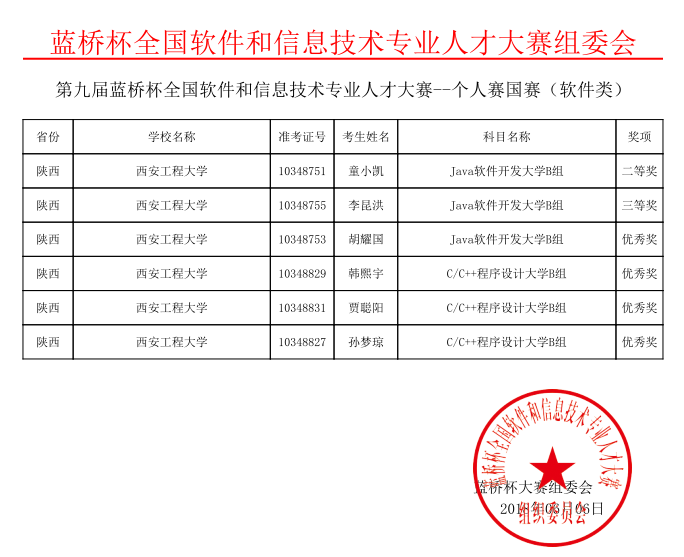 “第九届蓝桥杯全国软件和信息技术专业人才大赛”全国总决赛于5月26日在北京隆重举行,来自千余所高校的5000余名蓝桥杯省赛一等奖选手云集京城,角逐蓝桥杯最高荣誉。9499www威尼斯高晓娟老师、王爱丽老师带领着6位同学参加C/C++程序设计和JAVA软件开发全国大赛。最终,童小凯获得了JAVA软件开发二等奖,李昆洪获得JAVA软件开发三等奖,胡耀国获得JAVA软件开发优秀奖,韩熙宇、贾聪阳、孙梦琼分别获得C/C++程序设计优秀奖。
