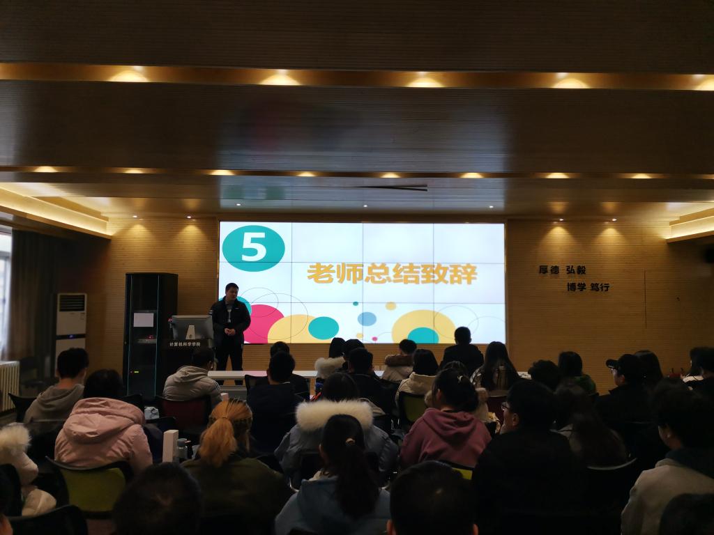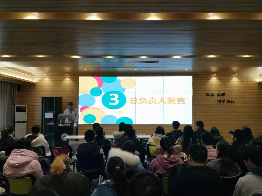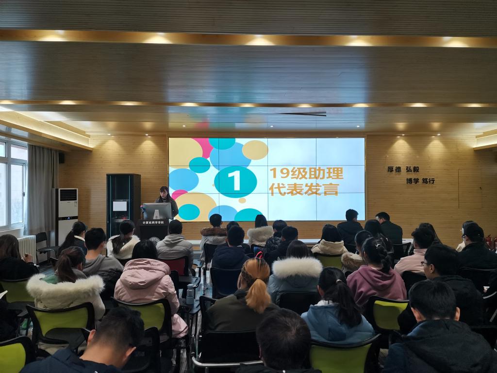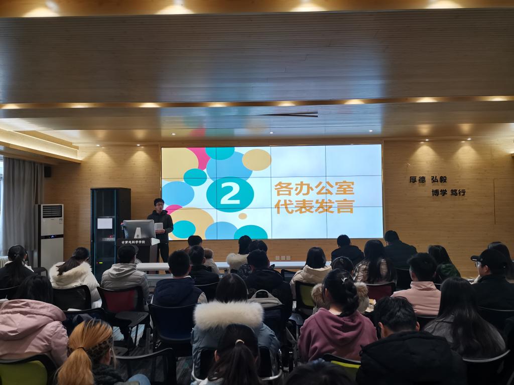 会上,首先,2019级计算机科学与技术卓越1班何琪同学代表大一助理进行了发言。她对自己这一学期的助理工作进行了回顾和总结,她说到“来到助理大家庭的这一学期自己学会了很多,也成长了很多,感受到了大家庭的温暖,也从各办公室老师那里学到了很多为人处事的方式方法,希望大家庭能够欣欣向荣、焕发蓬勃生机”。随后,各办公室助理代表高家兴、杨醒龙、赵子昂、李新凯,助理总负责人梁尊、魏彤也依次上台,从助理日常工作、日常管理、能力提升、团队建设、氛围营造等方面进行了详细的工作总结并对未来的工作提出了展望。
