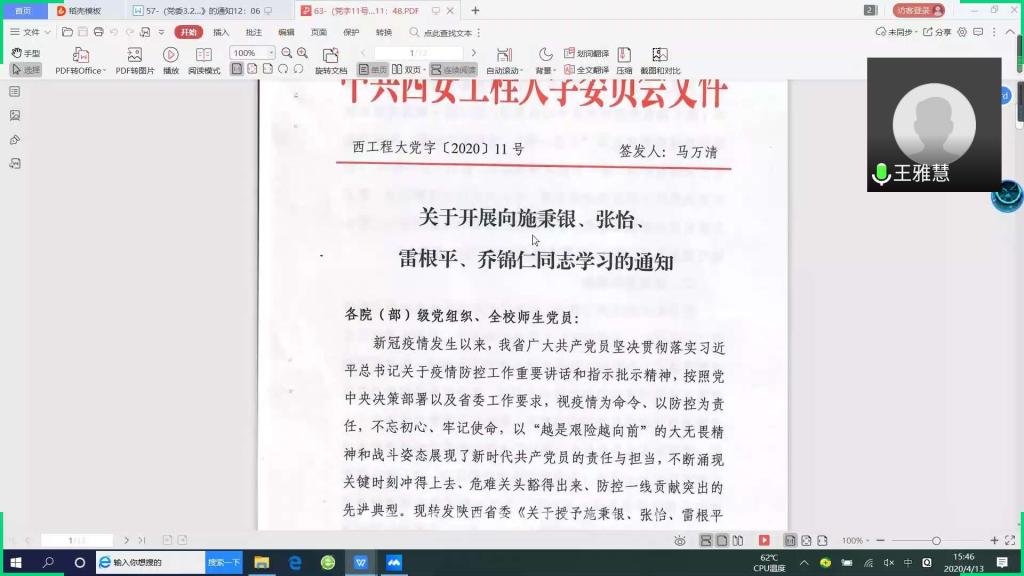 会上,王雅慧首先向大家传达了中共威尼斯9499登录入口委员会关于转发《中共陕西省委办公厅关于开展向“三秦楷模”施秉银、付凡平同志和赵梦桃小组学习活动的决定》和《威尼斯9499登录入口关于开展向施秉银、张怡、雷根平、乔锦仁同志学习的通知》精神并带领大家共同学习了先进典型的主要事迹。同时号召全院党员、教职工要以先进典型为榜样,她讲到:今年在疫情期间涌现了许多不畏艰险、身先士卒、甘于奉献的先进人物,其中也有很多是高校系统的医务工作者,当国家和人民有需要时,他们挺身而出、义无反顾地冲锋在前,战斗在抗“疫”一线,以实际行动践行初心使命。作为高校的教职员工肩负着立德树人的重任,一定要积极参加各党支部、系(实验中心)、办公室组织的学习教育活动。把向先进学习与本职工作结合起来,将学习内化于心、外化于行,立足本职,在自己的工作岗位上建功立业。