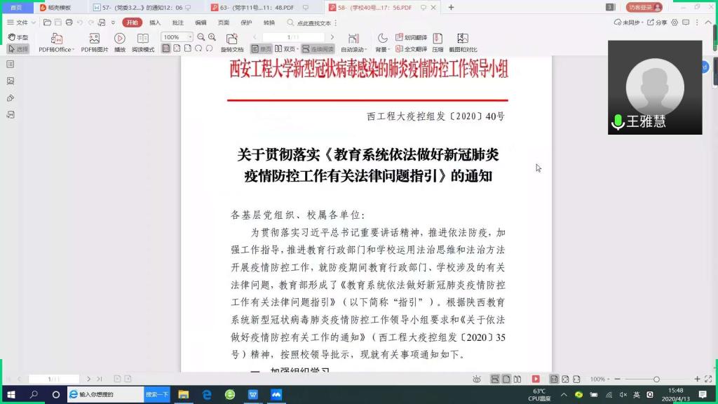 随后,王雅慧带领大家学习了学校关于贯彻落实《教育系统依法做好新冠肺炎疫情防控工作有关法律问题指引》(以下简称指引)的通知,并就《指引》的全部内容给大家进行了解读和培训。