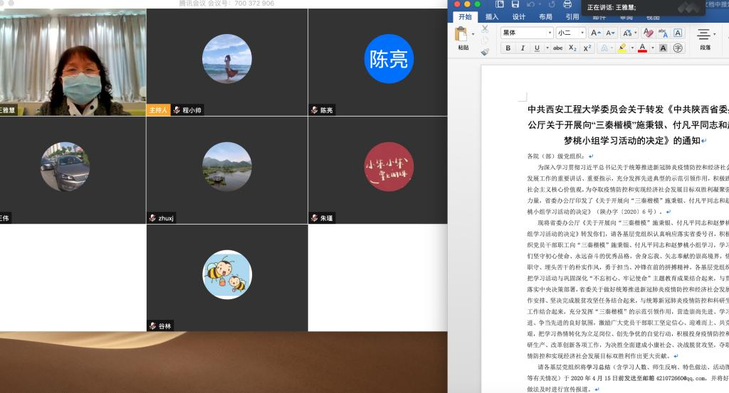 4月13日下午,9499www威尼斯召开党委理论学习中心组学习会,认真学习施秉银等“三秦楷模”和全省优秀共产党员的先进事迹并开展讨论交流。会议采取线上线下相结合的方式进行,会议由院党委书记王雅慧主持。