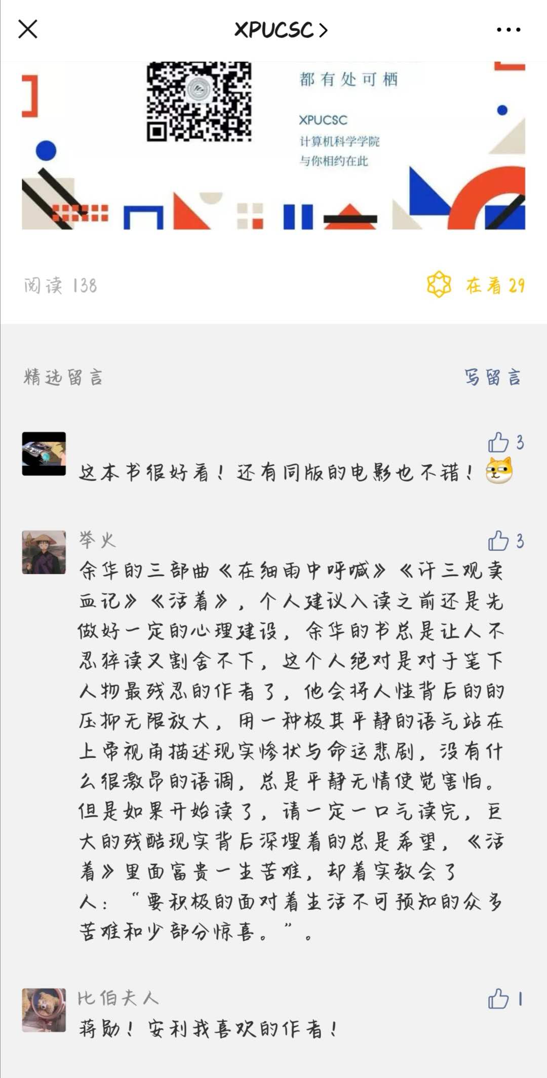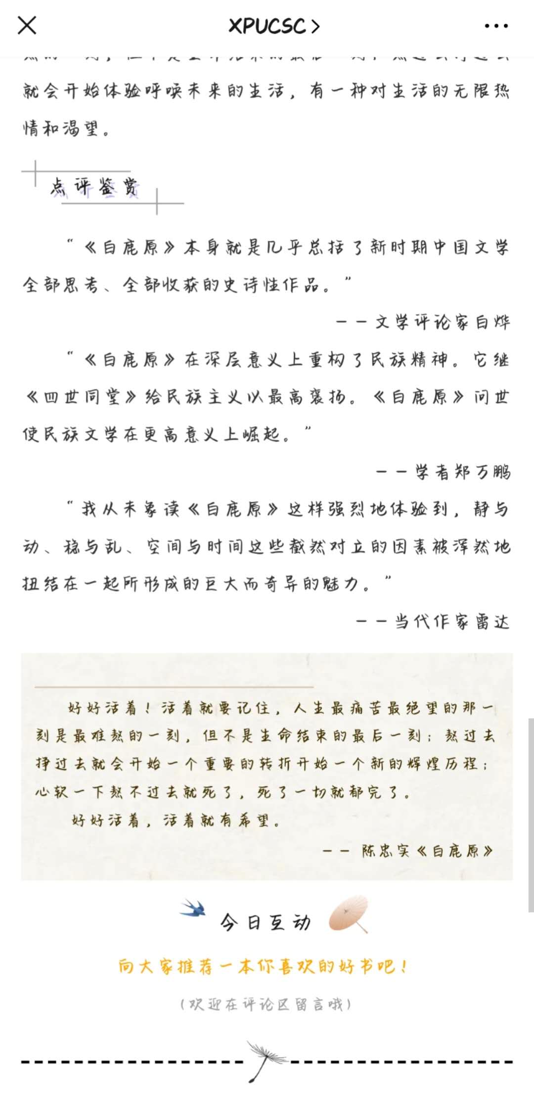 读书活动开展以来,学院师生广泛参与,纷纷利用空闲时间勤读书、读好书、用好书,不断提升文化素养。学院团总支也定期开展线上读书交流分享会,师生们通过线上主题讨论、撰写读书笔记、分享读书心得等形式投身其中;学院官方微信公众号也将推荐书目的精彩内容节选、点评鉴赏等信息进行在线推广,并在每期推送文末开放互动话题讨论,给热衷读书的师生搭建“以书会友”的平台,收获更多专业以外的知识,提升自身文化内涵。
