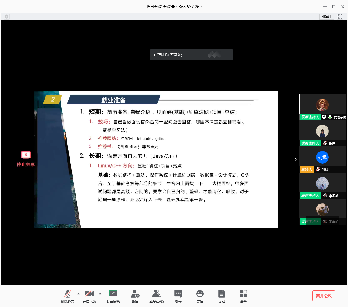随后,签约京东的索渝东同学、签约滴滴的张宇航同学、签约字节跳动的郭文峰同学、签约网易的李孟敏同学分别进行了经验分享。他们都结合自身找工作的具体经历,从技能准备、应聘材料准备、面试准备等环节分享了自己的经验。他们也都积极鼓励学弟学妹们将就业的各项准备工作做在前、走在前;多去尝试投递实习简历,深入行业企业了解企业所需,认真储备知识,为大四找工作做好充分的准备。