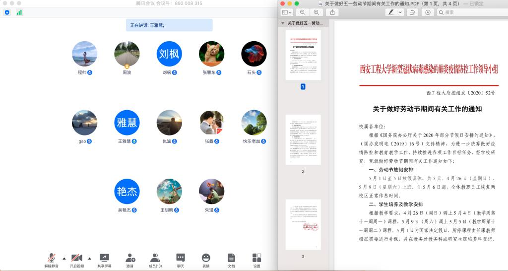 最后,院党委书记王雅慧对王进富副校长来学院调研指导就业工作反馈的有关情况进行了传达,重申了当前就业在学院各项工作中的重要地位,也希望全体教职工能够为这次专场网络视频双选会做好各项充分准备。临近五一假期,她还就学校关于做好劳动节期间有关工作的通知、关于重申劳动节廉洁自律要求的通知做了说明,并对各系提出了要求,同时还传达了4月22日临潼疾控中心主任刘建民做的高校新型冠状病毒肺炎防控培训精神。(撰稿人:朱成功   审核:王雅慧  周波)