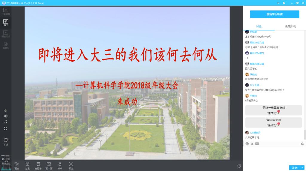 随后,朱成功以“即将进入大三的我们该何去何从”为题从疫情防控状态下学校当前相关政策和规定、线上教学学生学习状态、认清就业形式提前做好规划、居家空余时间该如何利用等方面给同学们做了分享,并督促全体同学居家状态虽缺乏监督,但更要时刻谨记学生的身份,在做好疫情防控的同时,努力学习、积极奋进,切记不进则退、慢进亦退;各班级、宿舍之间多自发开展线上交流,分享各自规划,互相鼓励,共同进步,为返校后接续学习打好基础。(撰稿:朱成功 审核:周波)