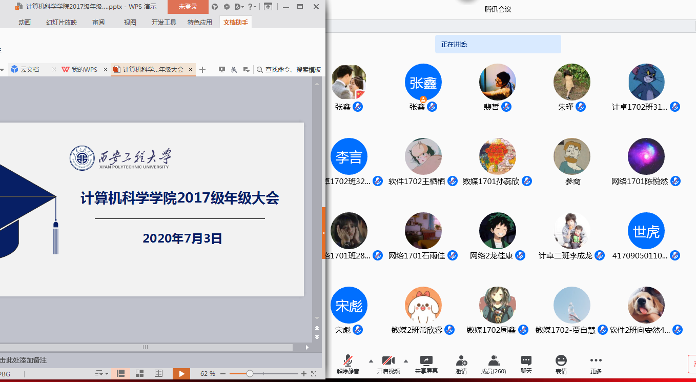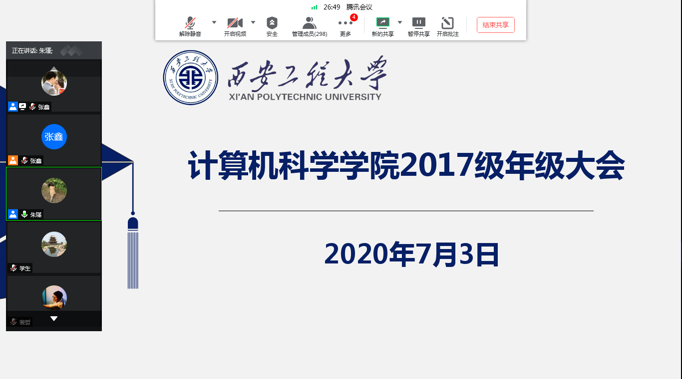 7月3日晚,9499www威尼斯召开2017级全体学生大会,学院党委副书记周波、学工办主任朱瑾、2017级辅导员张鑫及2017级全体同学参会。会议采用腾讯会议线上进行,由张鑫主持。