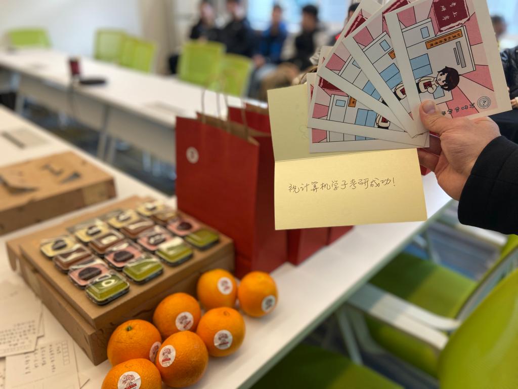 活动的最后,老师们共同为考研学子送上了学院精心准备的助力加油包。加油包包含了寓意“脐”开得胜,马到“橙”功的脐橙和金榜“糕”中的温馨蛋糕以及承载老师同学祝福的“考研上岸、逢考必过”明信片,以此来为考研学子加油打气。