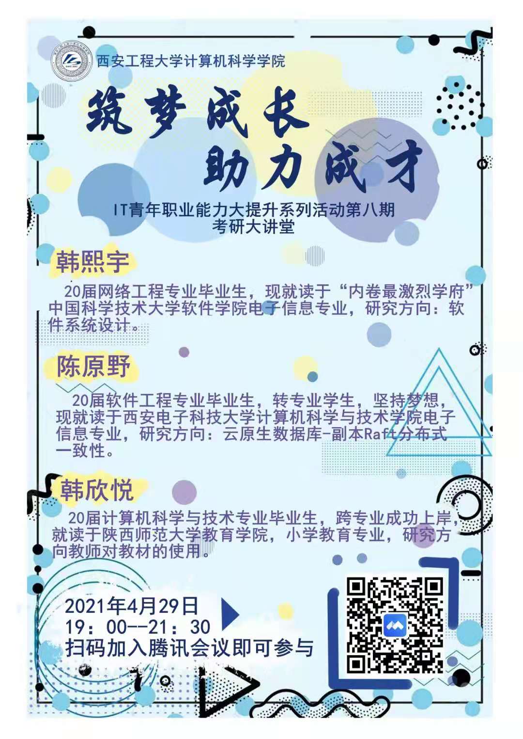 首先,由就读于中国科学技术大学软件学院电子信息专业的韩熙宇同学进行分享,重点为大家分析了考研复试中的英文介绍、专业知识、项目经历等方面注意事项,并且结合学科特点,针对项目经历内容为大家做了详细的分析。就读于西安电子科技大学计算机科学与技术学院电子信息专业的陈原野同学,从宏观的角度介绍了考研复试的流程等内容,针对近两年因疫情的线上面试这一环节进行了重点分析,并结合自己的面试经验向同学们进行分享。最后由跨专业成功上岸的陕西师范大学教育学院的韩欣悦同学,着重讲了搜集信息的重要性,并为大家提供了几个较为重要的搜集渠道。