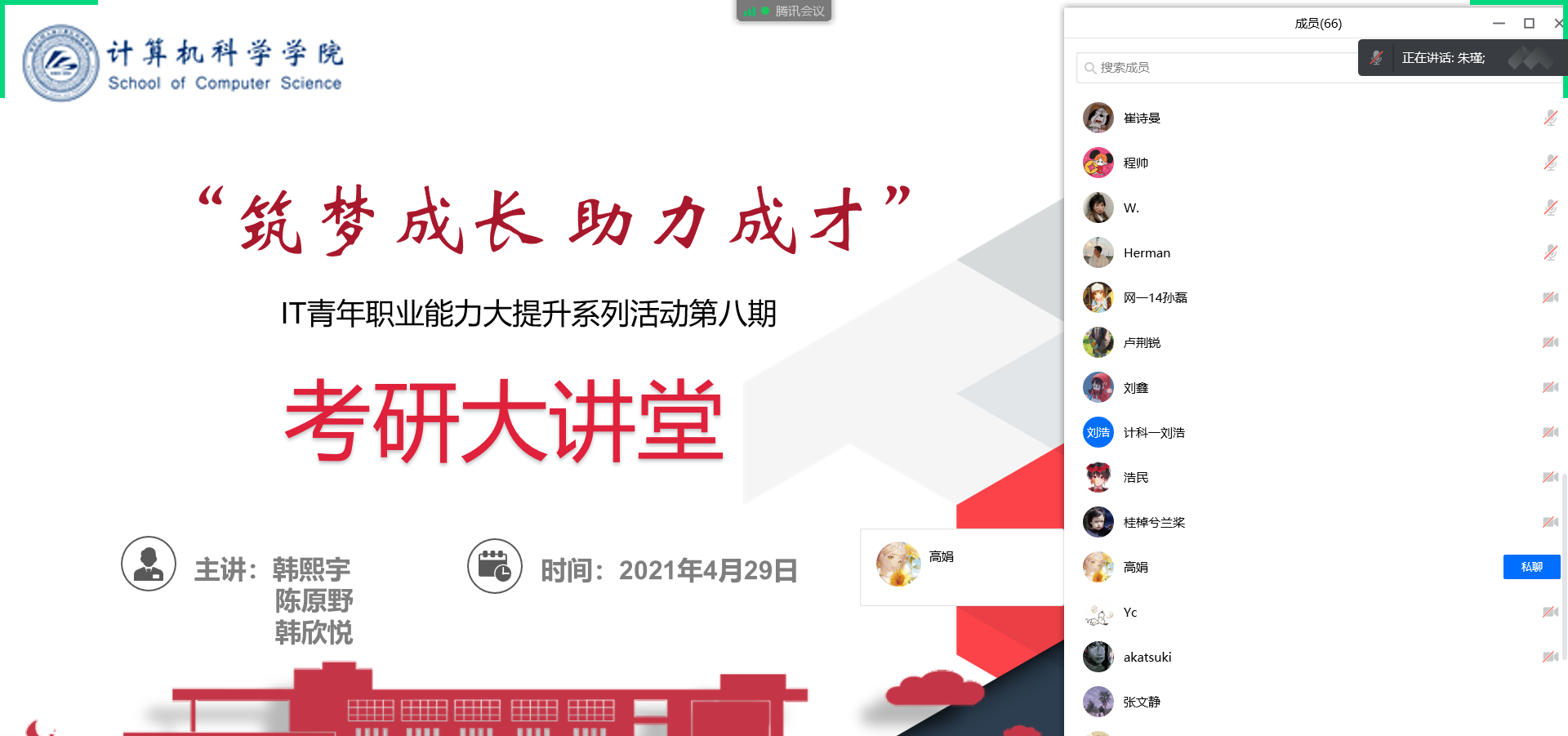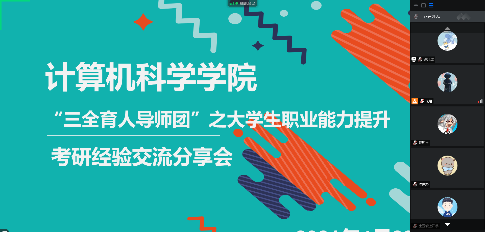 4月29日晚,9499www威尼斯组织召开了2021年考研经验线上交流会,旨在提高我们学生考研成功率。本次分享会邀请了2020届毕业生韩熙宇、陈原野、韩欣悦分享自己的成功的考研经验,并现场答疑解惑。全体辅导员参会,会议由朱瑾主持,共有120余名学生参加。