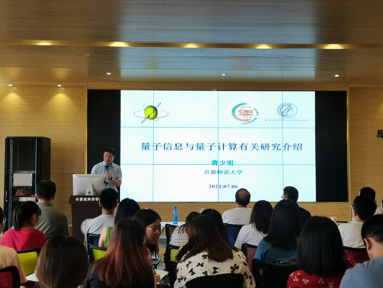 会议伊始,王伟对出席本次会议的两位专家进行了详细的介绍,并对专家的到来表示热烈的欢迎。接着,费少明从量子信息处理、量子计算的基础知识及相关数学问题出发,讲述了自己近期在量子相干性的度量、量子纠缠见证、量子非局限性、量子信息掩蔽、量子张量网络压缩感知及机器学习等领域的相关研究工作。