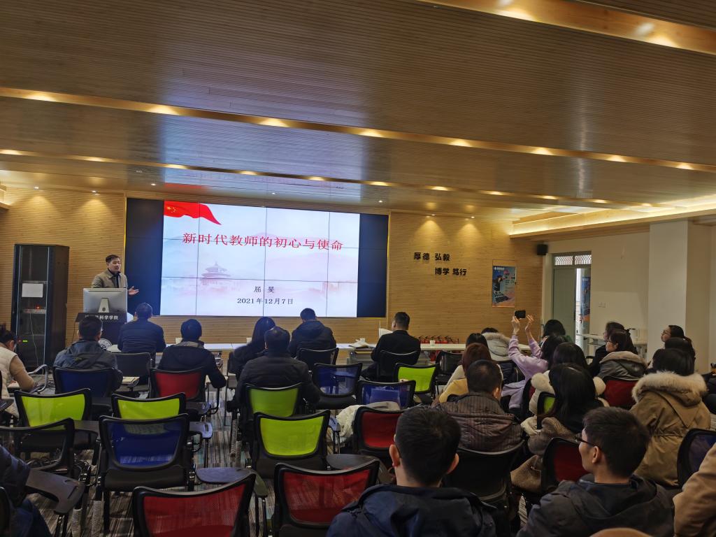 12月7日,9499www威尼斯在临潼校区7号楼614报告厅举行师德师风专题报告会。邀请马克思主义学院屈旻副教授做“新时代教师的初心与使命”现场报告,学院联系校领导、校党委副书记赵小峰出席会议,学院70余名教职工聆听了报告会。会议由院长薛涛主持。