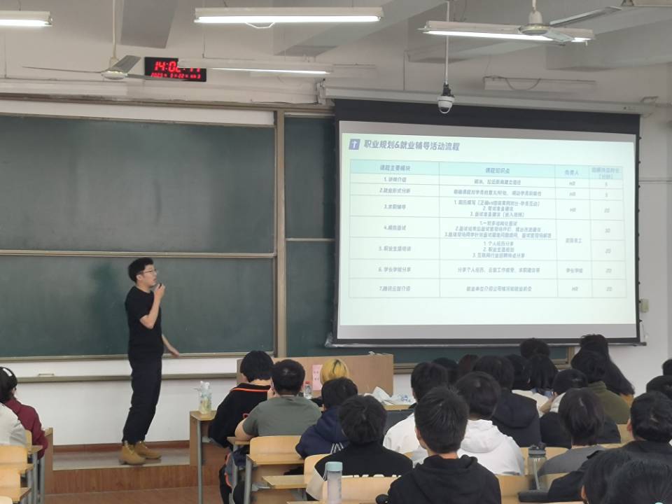 在讲座中,杨禹佳围绕大学生职业选择和职业规划,就大学生如何进行角色转型、适应职场提出了建议。他着重分析了学生在大学期间完成学业目标和进入单位后完成工作目标的区别与差异,提示学生在就职过程中需要注意的事项和在从事具体工作中需要具备的素质能力。他列举了很多生动真实的场景案例,对准备求职的同学有很好的启发作用。他从学校与职场的区别、角色转换、职业素养、职业心态、职业技能和职业习惯等六个角度为即将踏入社会的学生带来了一堂精彩纷呈的职业生涯规划课程。最后,学院邀请在企业求职的毕业生史强和学弟学妹们分享个人经历、工作感受和求职建议等。