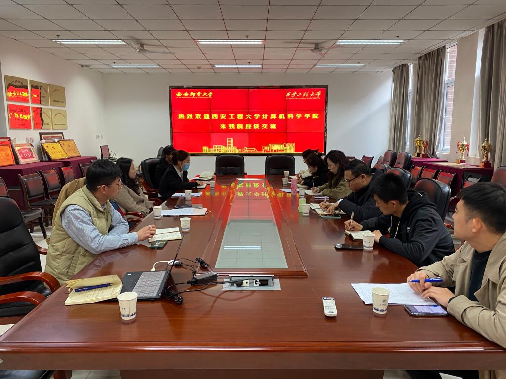 刘柯首先代表西安邮电大学计算机学院对我们一行表示热烈欢迎。随后双方各自介绍了学院的专业设置、历史沿革、师资力量、学生工作思路、做法、经验和成效,并就互相关心的守好安全稳定底线、学生就业、学风建设、三全育人、学生思想政治工作、学生资助、心理育人和科技竞赛等方面工作进行了深入沟通。
