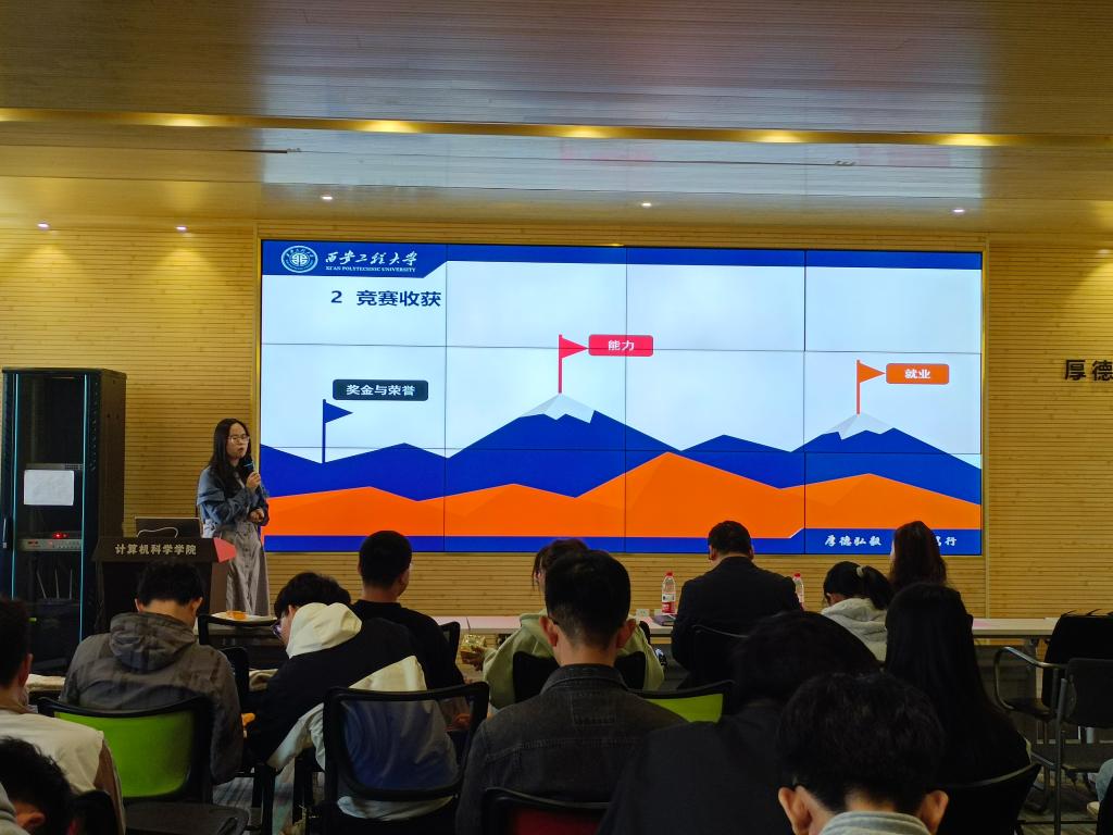 接着,毕明洋做主题为《学海无涯-玩转竞赛》的分享。她结合自己的参赛经历向在座同学们讲述了各项学科竞赛的参赛要求和注意事项,包括中国国际“互联网+”大学生创新创业大赛、“挑战杯”全国大学生课外学术科技作品竞赛、中国研究生数学建模竞赛和中国研究生电子设计竞赛等,帮助大家了解比赛,同时分享了在参赛过程中的收获与感悟,鼓励大家通过参与比赛来提升专业能力。