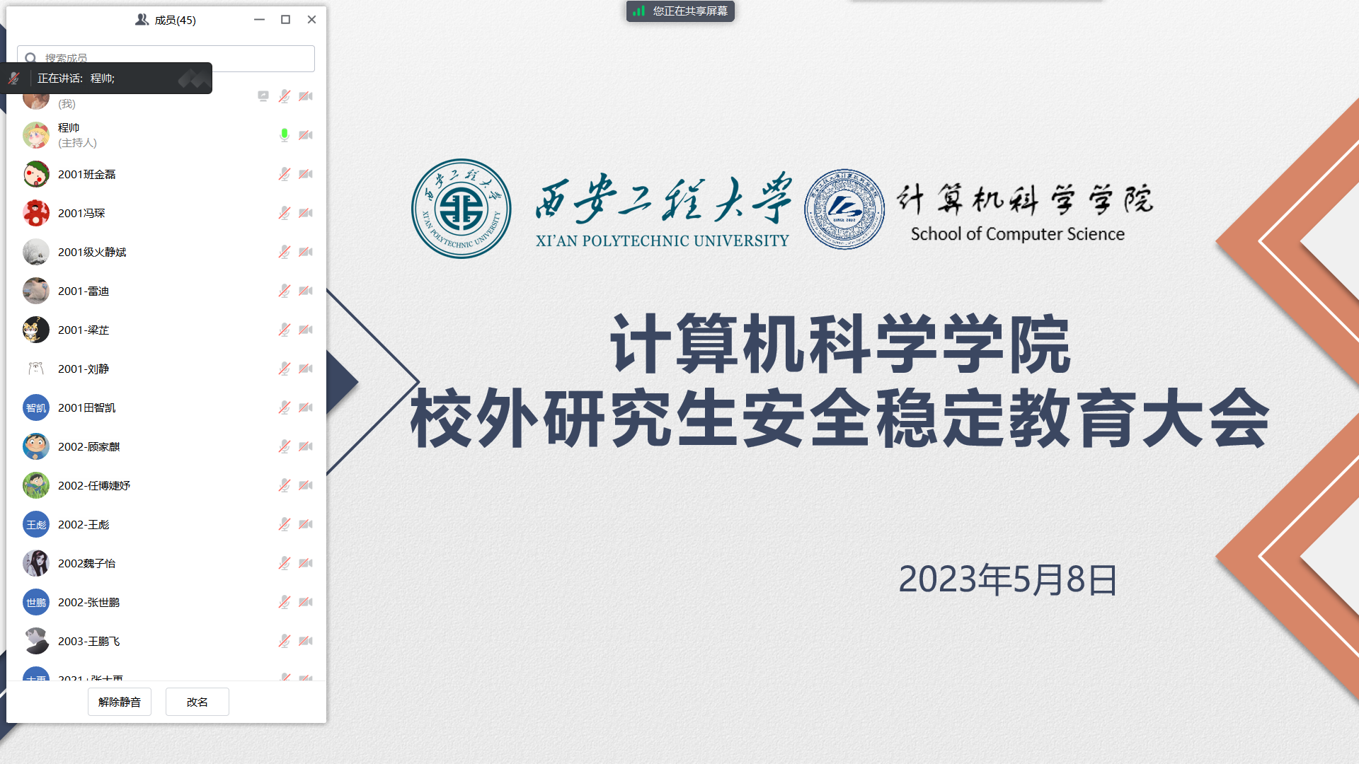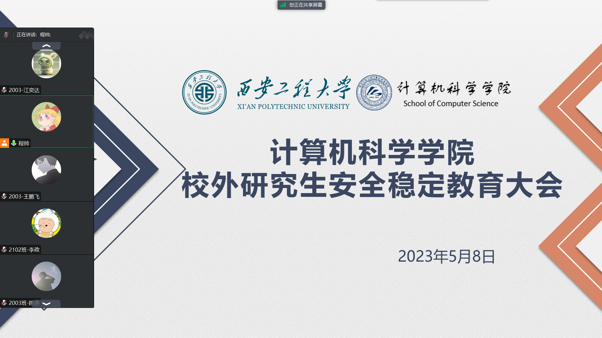程帅首先向与会学生说明了本次会议的目的,并就学校研究生校外实习及请假规定进行了详细解读。她强调学生在校外期间要有风险防范意识,把始终把个人安全问题放在首位,遇到突发情况要第一时间向辅导员老师反映,同时要及时报警;提醒学生必须遵守国家法律和法规,不得发生有违社会公德和损害学校声誉的行为;在校外也要随时关注学校、学院发布的各类信息和有关通知要求,不要耽误校内的各项事务。她最后鼓励校外研究生积极参加我们第一届研究生人工智能创新大赛,将实习所得和科研项目转化为科技竞赛的成果,为就业打下较为坚实的基础。