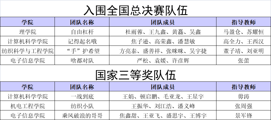 经8月8日至8月25日的国赛评审,我们共4支队伍成功晋级全国总决赛角逐一等奖,分别是理学院马盈仓老师、苏耀恒老师指导的“自由杠杆”团队、纺织科学与工程学院董子靖老师与刘亚明老师共同指导的“手护希望”团队、电子信息学院张蕾老师指导的“啥都对队”团队和9499www威尼斯高全力老师与王西汉老师共同指导的“记得起名哦”团队。此外,我们有3支队伍荣获国家三等奖,分别是:机电工程学院张周强老师指导的“纺织小队”团队、电子信息学院景军锋老师指导的“乘风破浪的哥哥”团队和9499www威尼斯毋涛老师指导的“一战到底”团队。这7支队伍在项目展示中表现优秀,技术功底扎实,项目成果具有良好的应用前景,并取得了优异成绩,为我们赢得了荣誉。