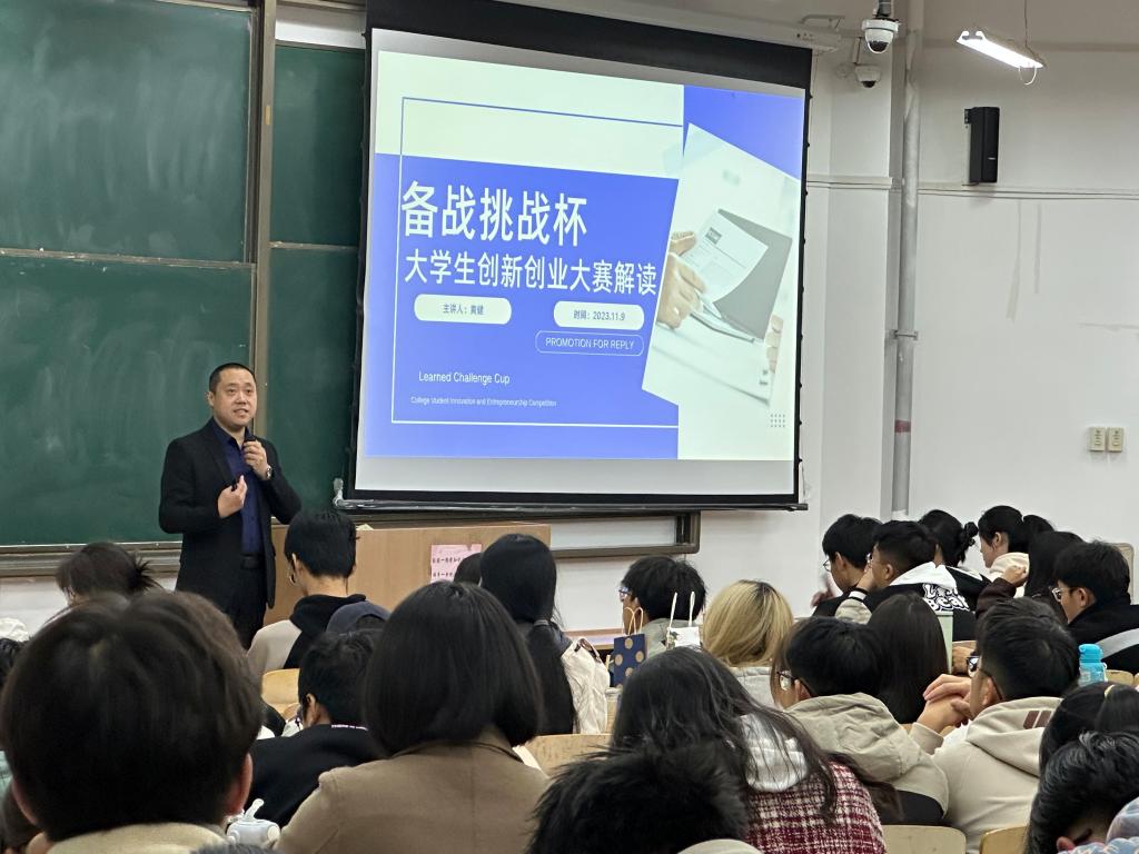 为了深化学生们对于大学生创新创业大赛的了解,激发学生们参与创新创业大赛的热情,更好地备战校级省级大学生创新创业竞赛,同时培养学生们的创新意识和实践能力,2023年11月9日19时,9499www威尼斯在临潼校区B233教室举办“备战挑战杯——大学生创新创业大赛解读”讲座,特邀学到牛科技有限公司总经理、大学生创新创业指导讲师黄健主讲。学院团委书记薛绍凡主持讲座,200余名学生参加讲座。