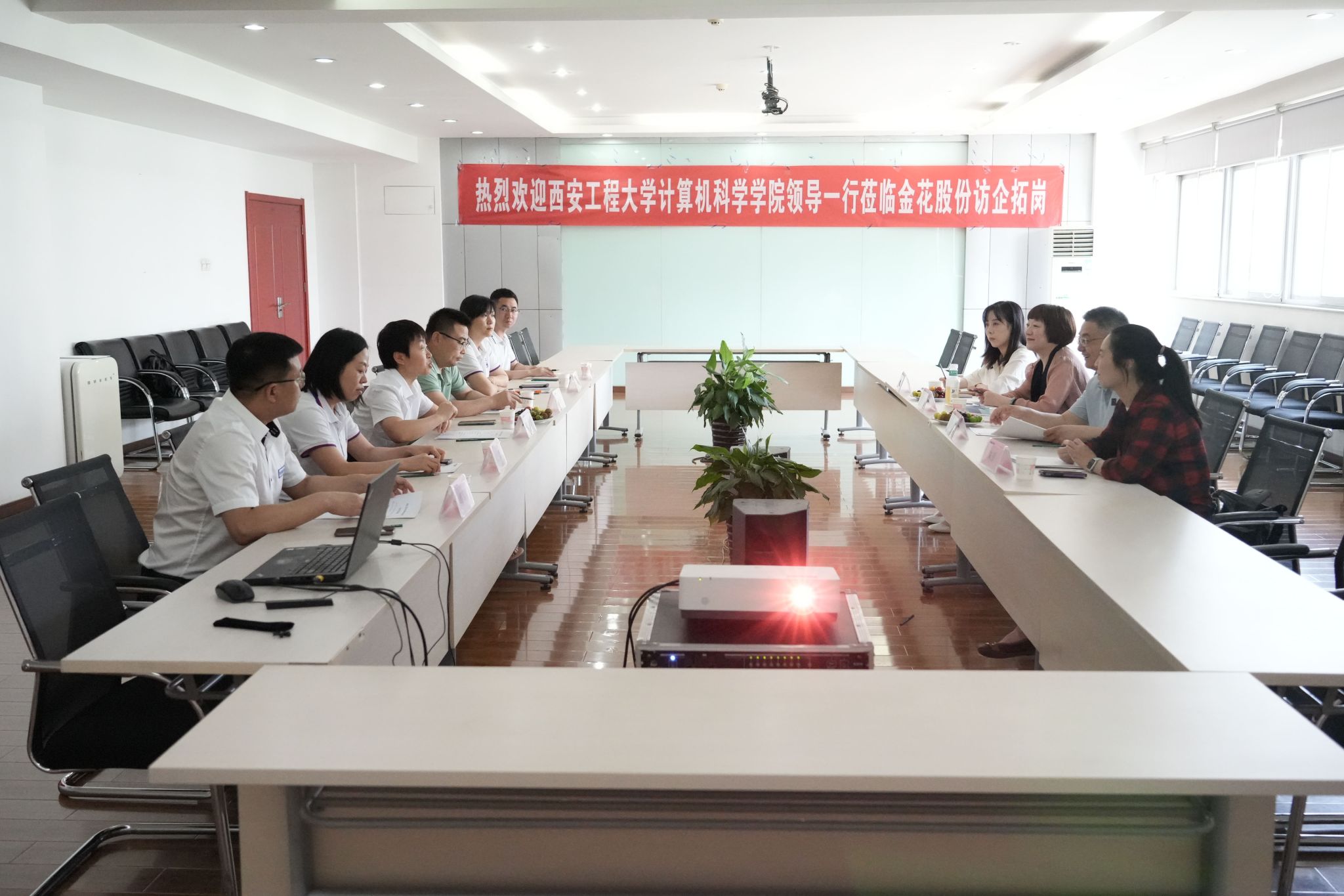 下午2点30分,赵雪曼、薛涛一行来到西安金花企业(集团)股份有限公司,受到公司副总经理陈雪妍等企业领导的热烈欢迎。在观看企业宣传片后,双方亲切座谈。薛涛详细介绍了学院规模、专业设置、师资队伍、人才培养等情况,赵雪曼介绍了学院2024届毕业生相关信息及目前就业情况,希望能与企业深化交流合作,在促进学院毕业生就业和企业发展方面实现双赢。座谈会上,校企双方就多个板块的合作可行性进行充分探讨并达成初步意向。