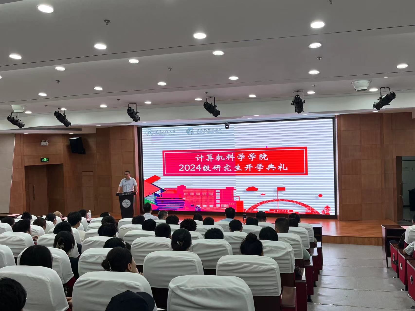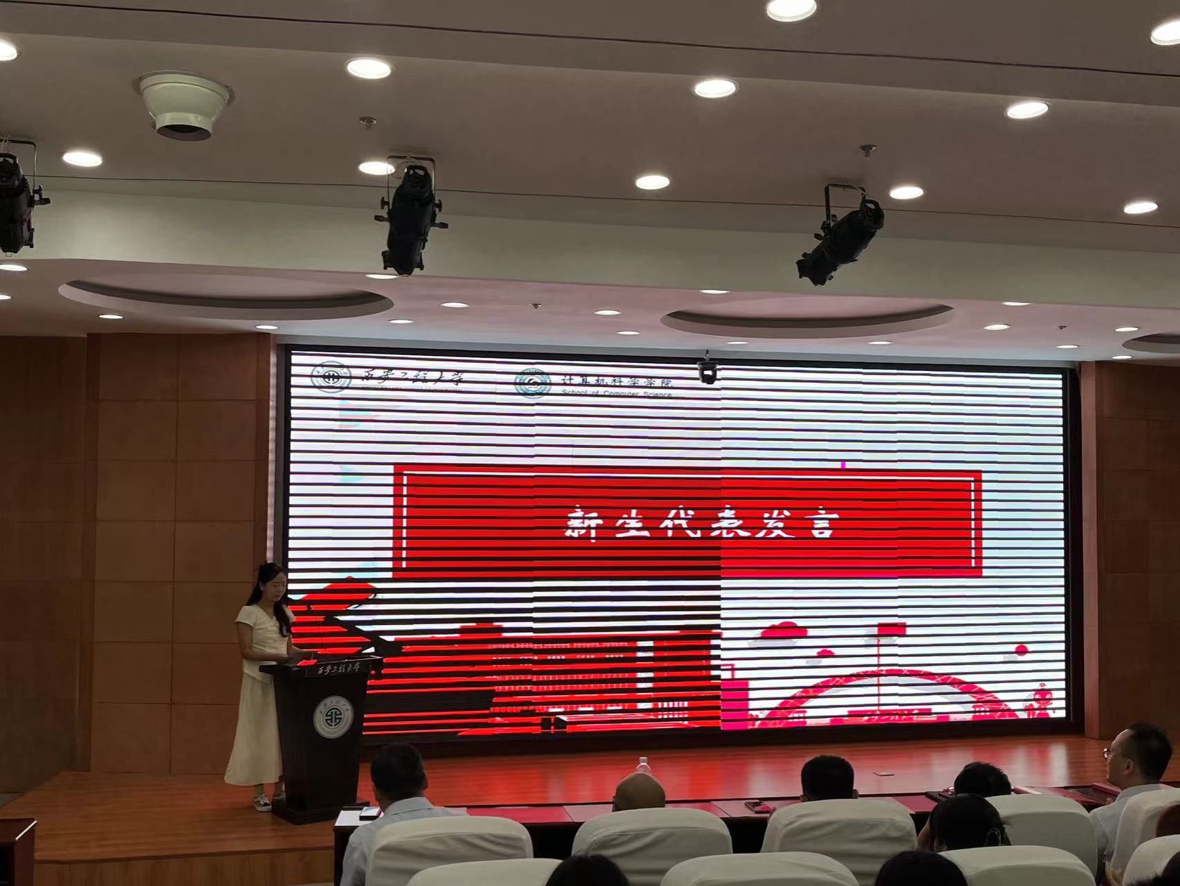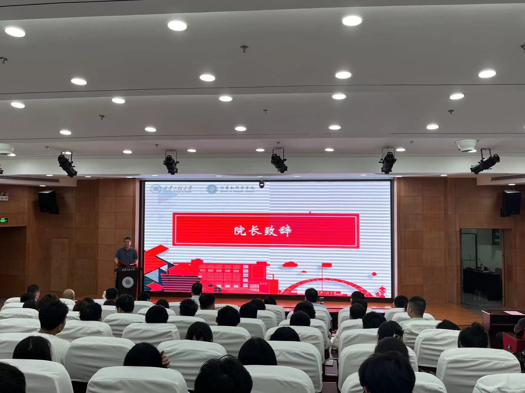 第一阶段开学典礼首先由院长薛涛教授致辞。他代表全院师生对新同学的到来表示热烈欢迎,简要介绍了学院当前的发展状况,向全体新同学提出了希望:一是希望同学们尽快熟悉环境,尽快融于计算机学院大家庭,尽快进入研究生学习科研状态;二是希望同学们紧密跟踪学术前沿进展,精研专业知识和前沿学术问题,注重提升专业实践能力,努力培养解决复杂工程问题和密切团队协作的能力;三是希望同学们在研究生阶段尽量拓展视野,敢于面对挑战,不断增强发现问题、分析问题、解决问题的能力,摒弃躺平思想,勇于追求卓越;四是希望同学们通过与导师、团队成员的紧密合作,促进自身尽快成长,并营造积极的学术氛围,为推进学院科研工作做出贡献。