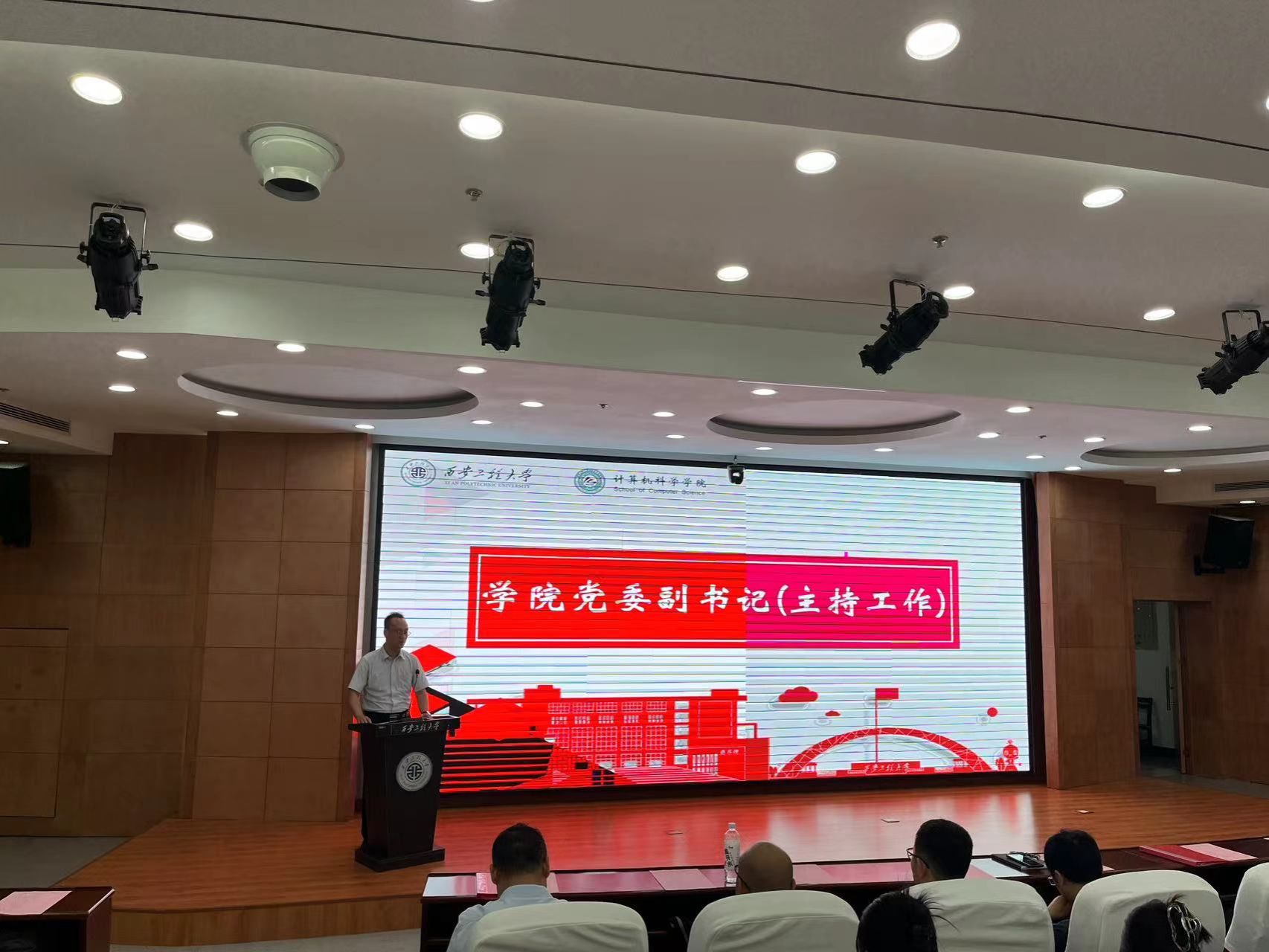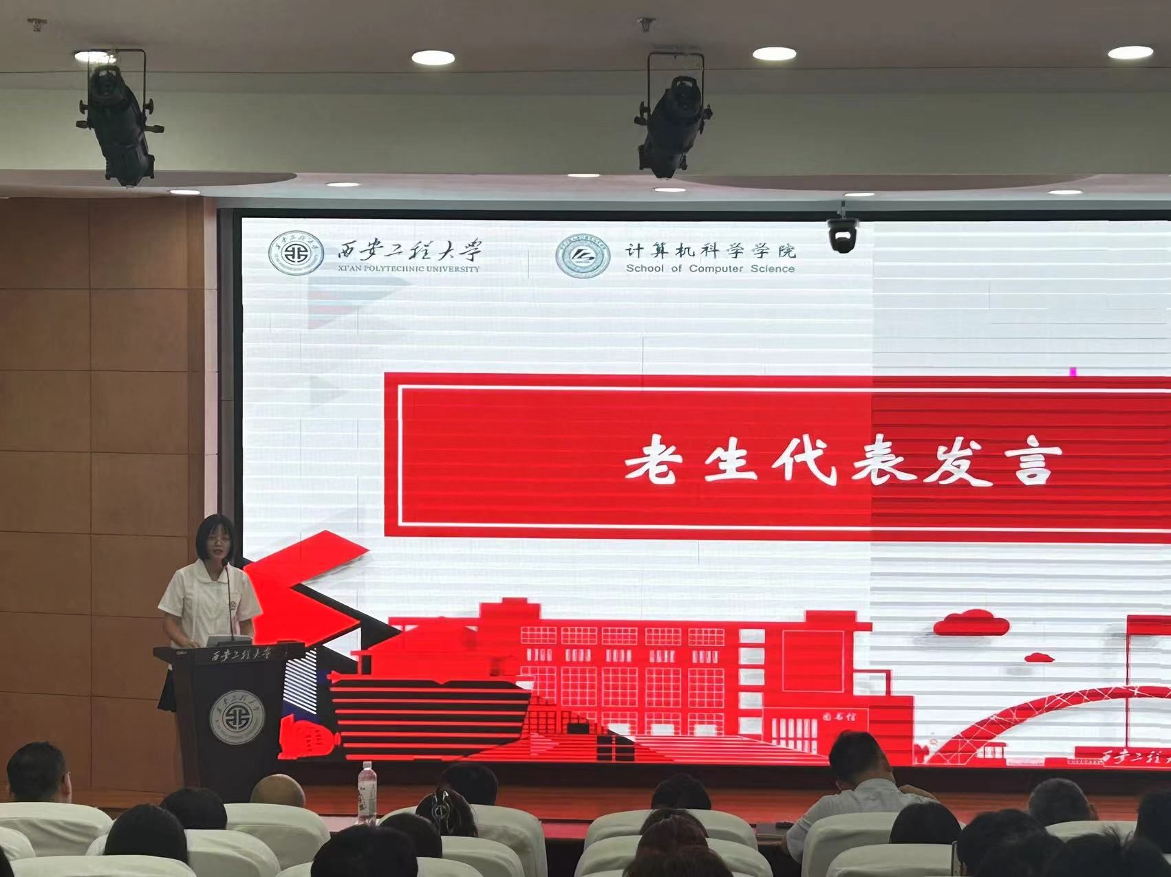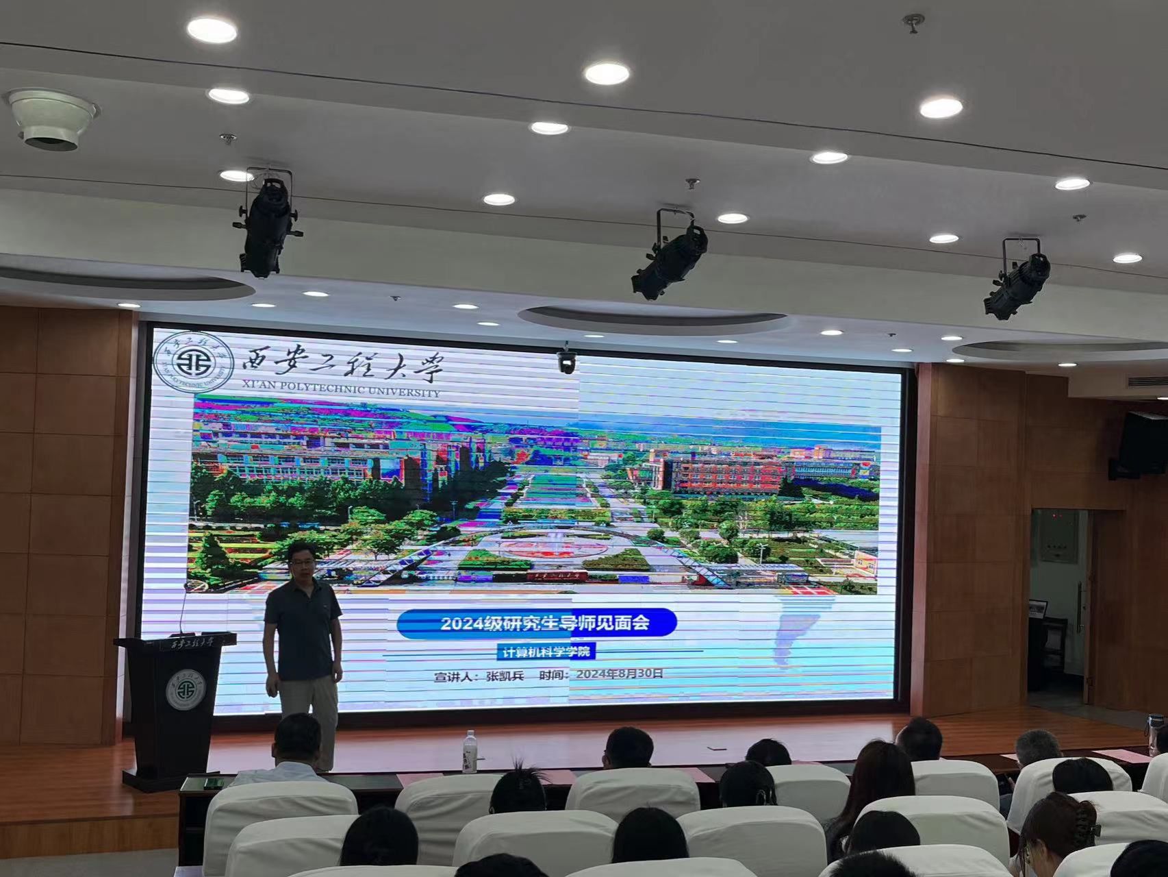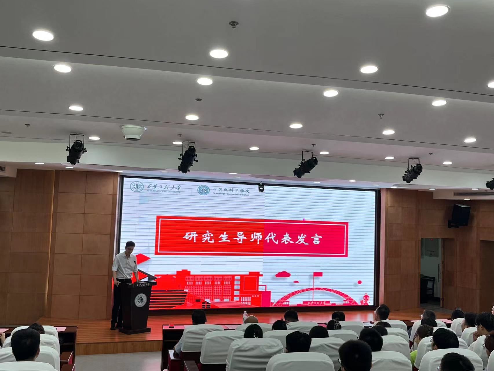 第一阶段开学典礼首先由院长薛涛教授致辞。他代表全院师生对新同学的到来表示热烈欢迎,简要介绍了学院当前的发展状况,向全体新同学提出了希望:一是希望同学们尽快熟悉环境,尽快融于计算机学院大家庭,尽快进入研究生学习科研状态;二是希望同学们紧密跟踪学术前沿进展,精研专业知识和前沿学术问题,注重提升专业实践能力,努力培养解决复杂工程问题和密切团队协作的能力;三是希望同学们在研究生阶段尽量拓展视野,敢于面对挑战,不断增强发现问题、分析问题、解决问题的能力,摒弃躺平思想,勇于追求卓越;四是希望同学们通过与导师、团队成员的紧密合作,促进自身尽快成长,并营造积极的学术氛围,为推进学院科研工作做出贡献。