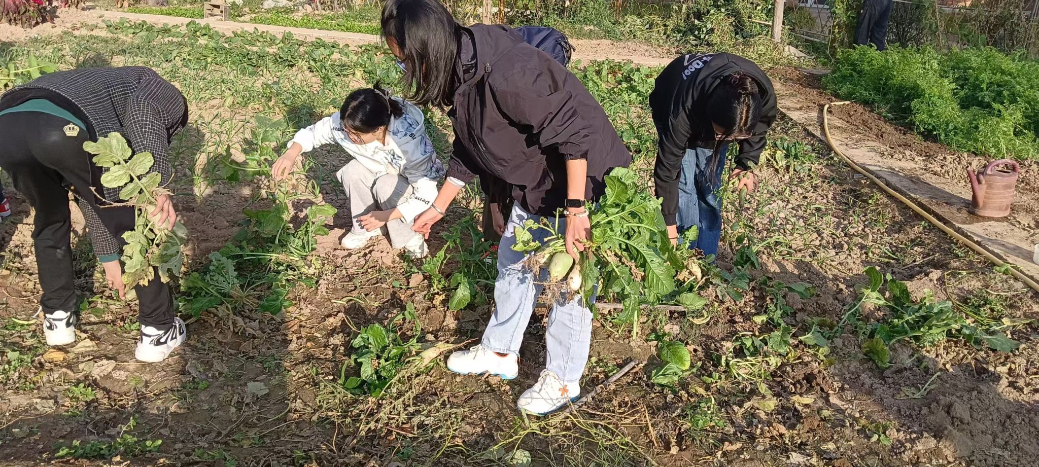 在随后的劳动实践中,老师带领同学们一起拔萝卜、除草、清理垃圾、翻整土地、播撒化肥和蔬菜种子。耕种小园的师傅在现场教大家怎样犁地、翻地、施肥、播种、浇水,怎样辨识不同的蔬菜,怎样使用各种农具。很多与劳动久违的同学在劳动过程中真切体会到了劳动的辛苦和播种的喜悦。“谁知盘中餐,粒粒皆辛苦”。各民族学生在共同劳动中更加体会到了在中华民族大家庭中各民族兄弟姐妹平等相待,团结互助,一起劳动为创造幸福生活而共同努力的深刻意义。虽然汗水浸湿了衣衫,但是大家在劳动中享受着快乐,都期待今天的播种明天就能发芽、生长,长出青翠甘甜的蔬菜。