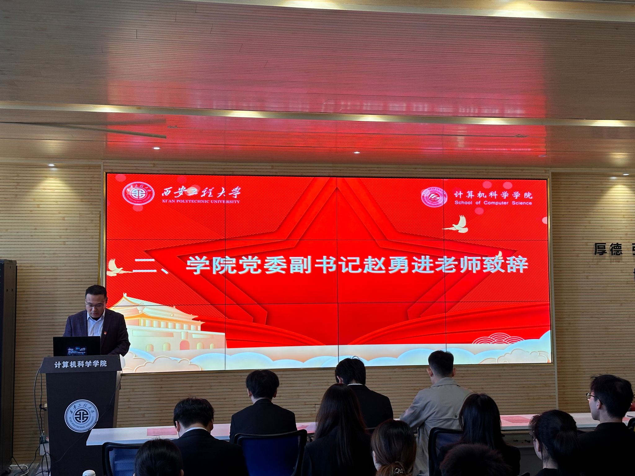 赵勇进代表学院党委对参加本次大会的代表致以亲切问候。他说,习近平总书记在党的二十大报告中鲜明指出:“当代中国青年生逢其时,施展才干的舞台无比广阔,实现梦想的前景无比光明”。在这个充满机遇和挑战的新时代,希望学院团学组织干部和广大同学做到以下四点:一是坚定理想信念,常怀家国之情;二是勤奋刻苦学习,筑牢实践之基;三是矢志奋勇争先,担当时代之任;四是锤炼优良品格,加强自身修养。赵勇进强调,“德”是每个人成长成才的前提基础,一个人的“才”只有与“德”相匹配,以“德”为引领,才能真正成为国家和人民需要的栋梁之才。他希望同学们自觉加强道德养成,让社会主义核心价值观的种子在心中生根发芽,把“听党话、跟党走”的青春誓言“内化于心、外化于行”,尽快成长为立志报国的新时代青年。