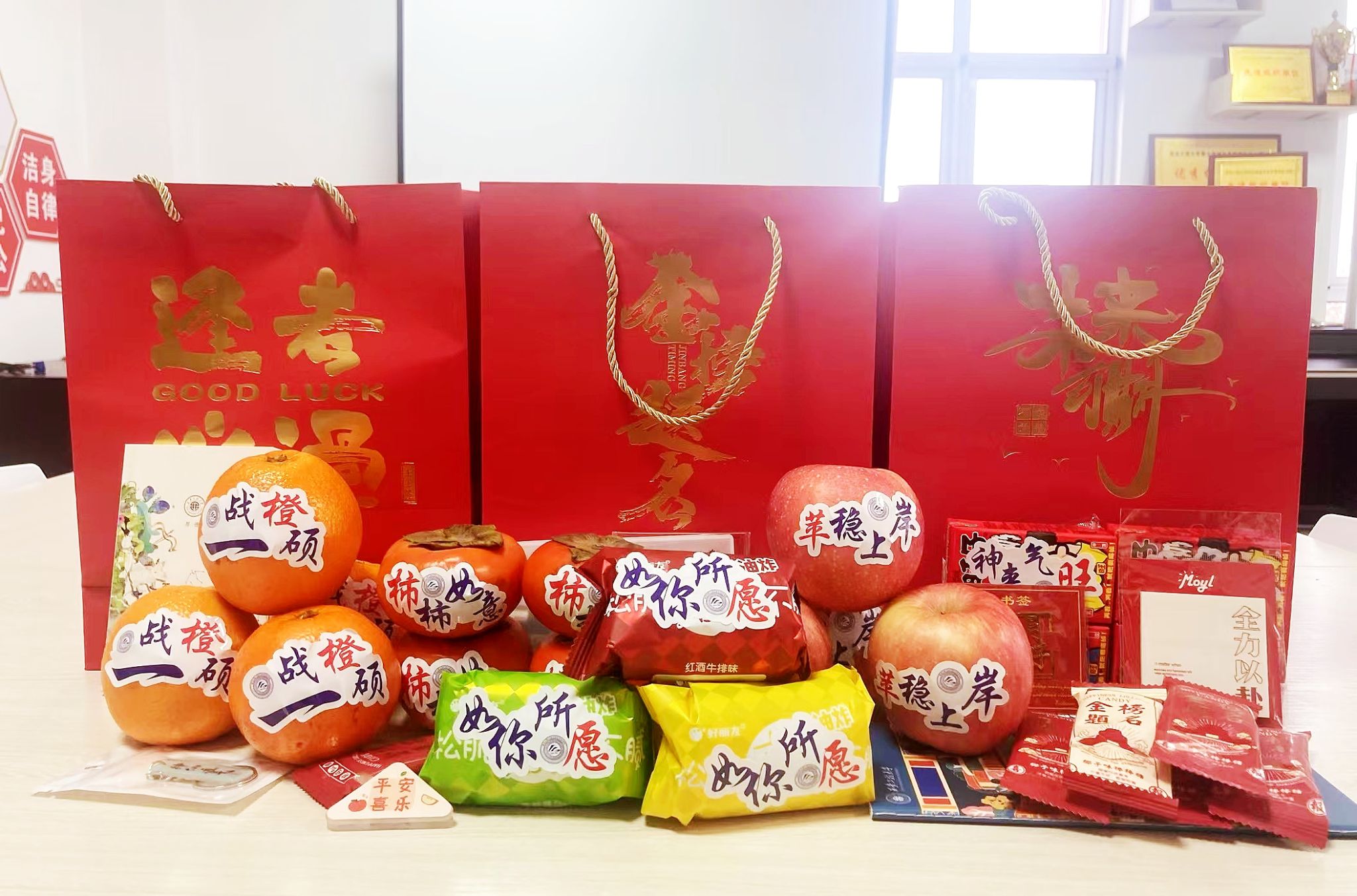 在活动现场,学院领导为考研学子们发放了精心准备的加油包。里面除了必备的学习用具和考研助力文创产品外,还装有寓意一战成硕的橙子、平稳上岸的苹果、事事如意的柿子、神来气旺的旺仔牛奶和如你所愿的薯愿薯片等,以此来为大家加油打气,为学子们的考研前行路增添一抹亮色,送上一丝温暖和力量。