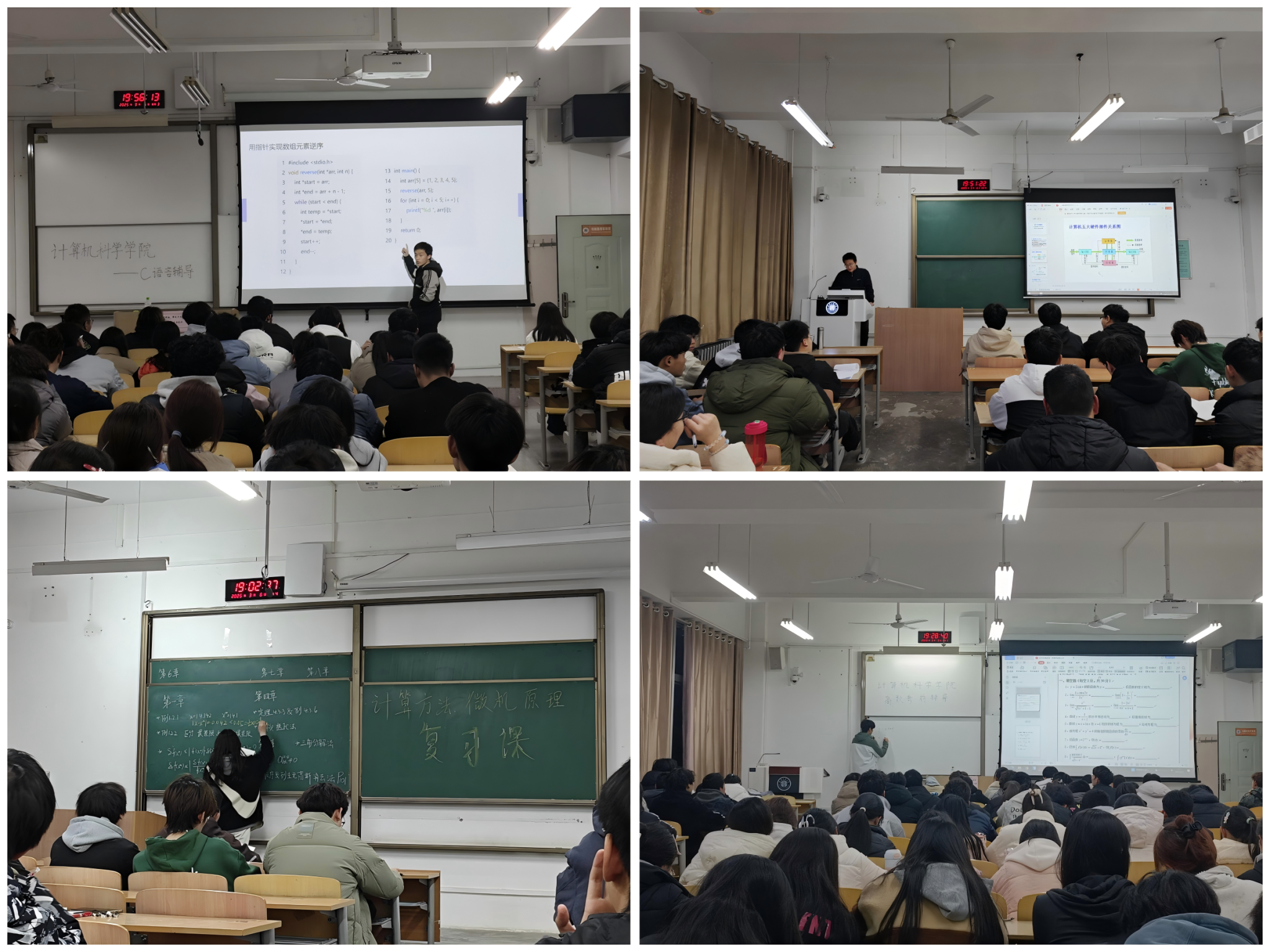 高等数学、高级语言程序设计、计算方法、微机原理等课程作为计算机专业课程中的重要基础学科,对学生的逻辑思维和分析能力要求很高,一直是许多学生学习道路上的“拦路虎”。为此,学院依托“一站式”学生社区服务平台,结合“我为群众办实事”实践活动要求,邀请了2023级计算机类专业学生徐华明、晁青松、马颢语、戴祖杰等优秀学生担任主讲。他们知识扎实、成绩优异,在上一学年获得奖学金、优秀学生等各项荣誉,课前精心设计教学方案,将自己的学习笔记整理成课件,课堂上重点讲解了常考点和易错点,鼓励同学们背诵公式、练习题型、加强复习,以充分的自信迎接考试。