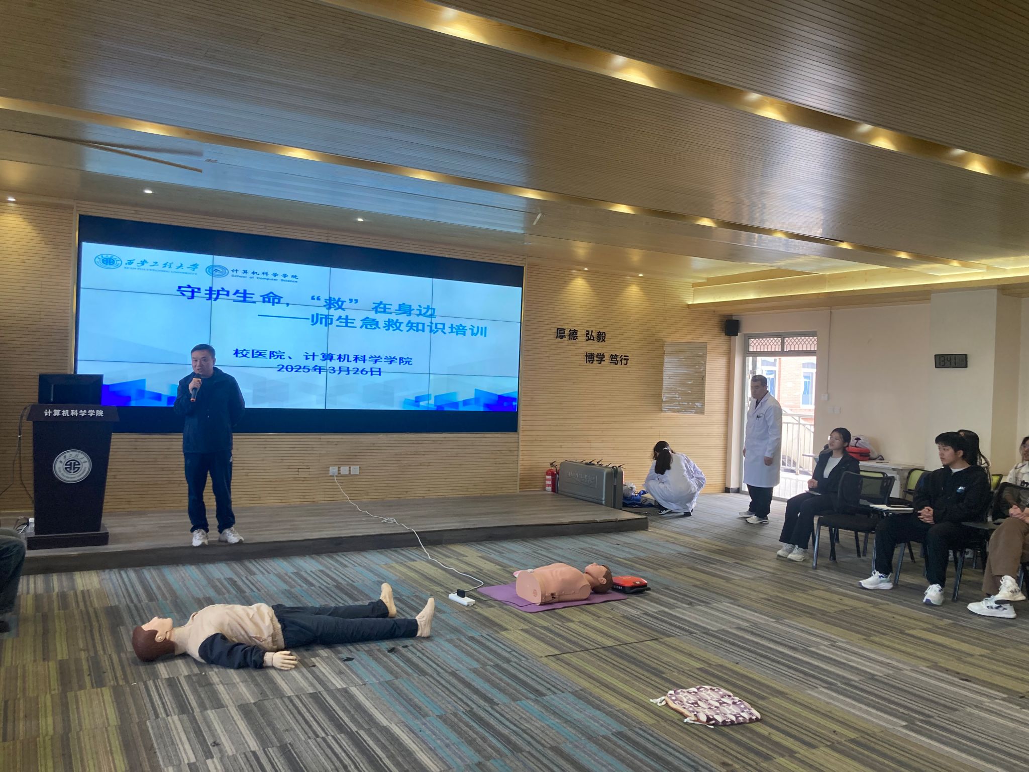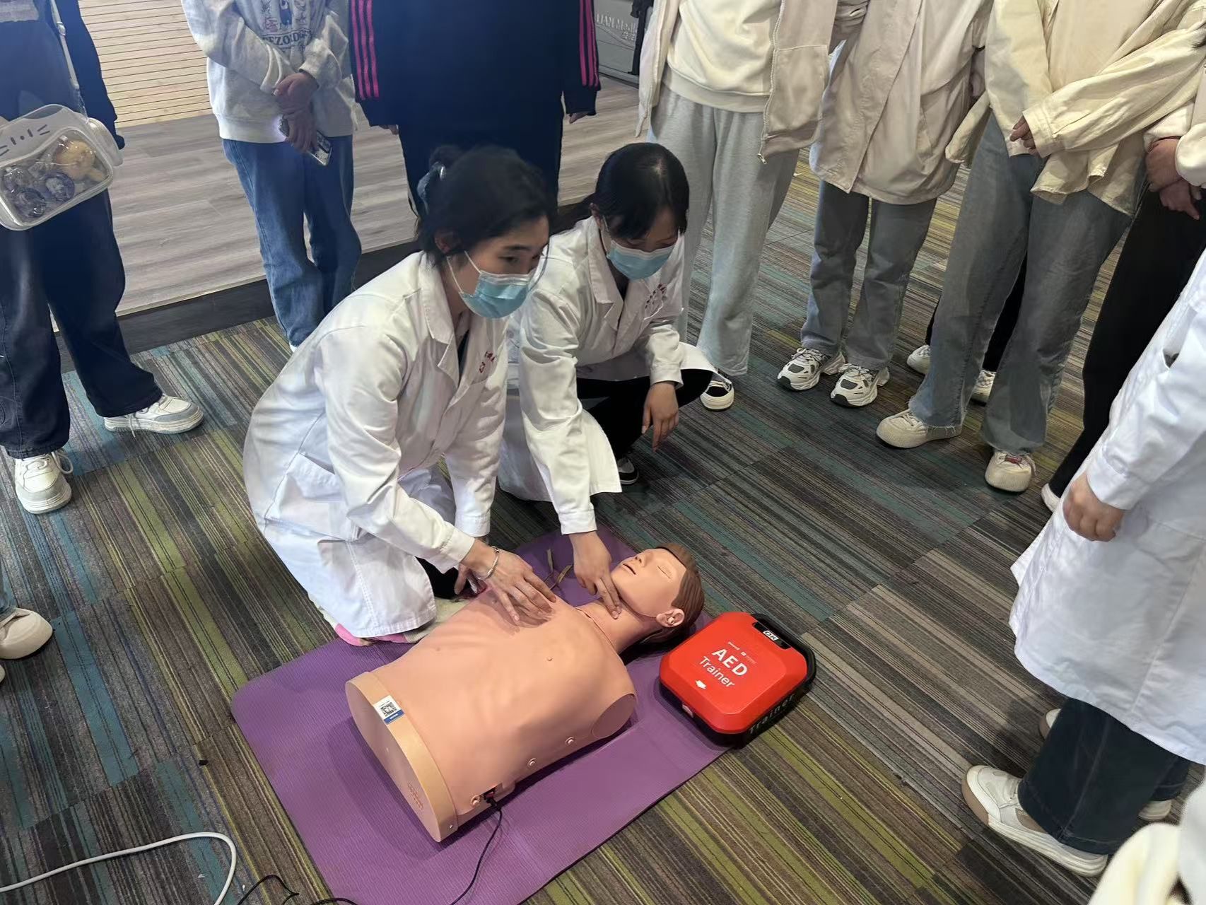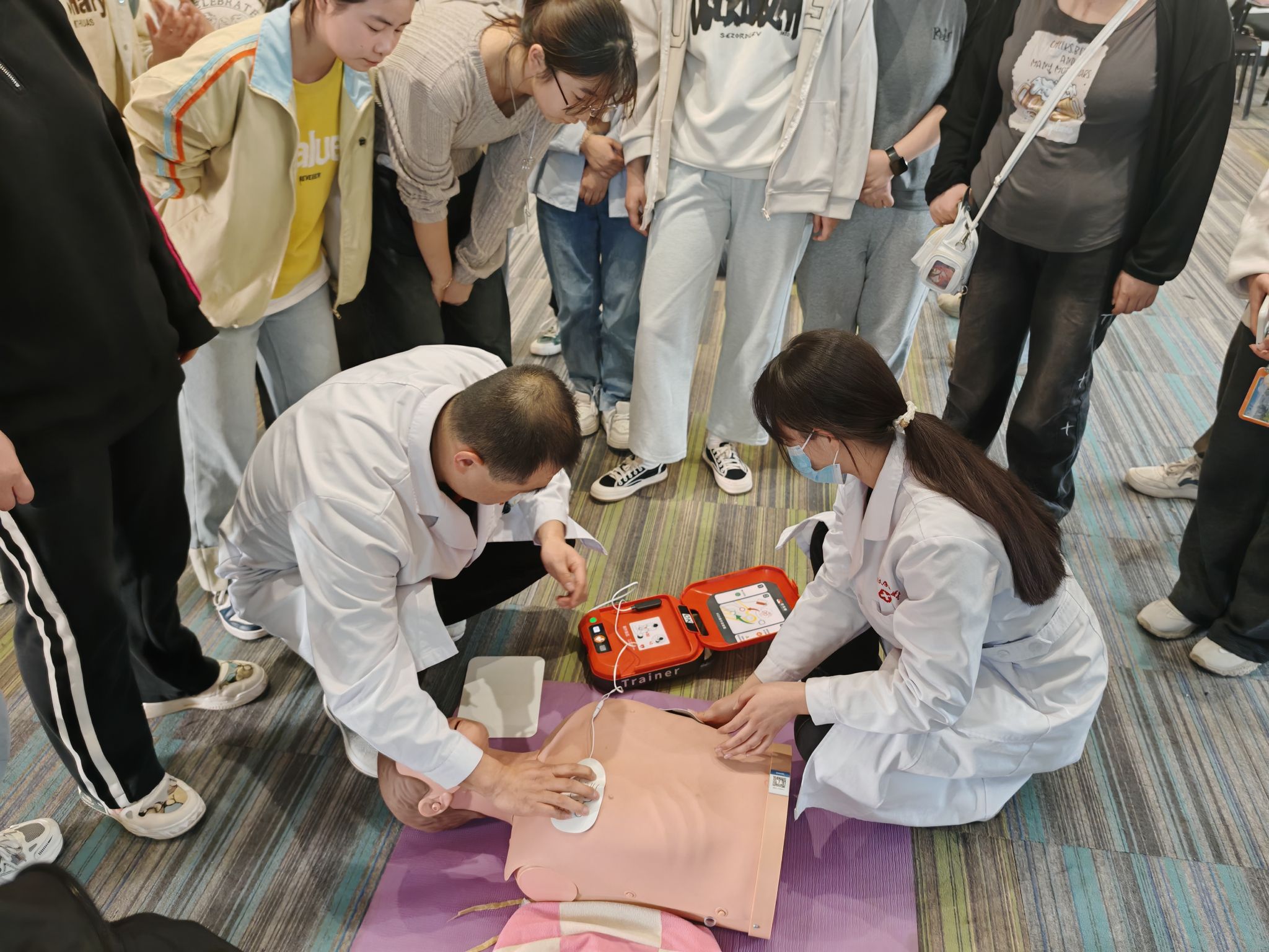 培训过程中,医护人员首先通过生动的案例和详细的讲解,向师生们普及了心肺复苏(CPR)、海姆立克急救法及AED(自动体外除颤仪)使用等急救技能知识要点。理论讲解结束后,医护人员利用人体模型进行实操演示,详细指导师生掌握急救按压位置、频率、人工呼吸技巧及AED操作步骤。现场师生踊跃上前练习,积极提问,在医护人员“一对一”指导下纠正动作,演练急救流程,掌握急救技能。活动现场,杨军宏还从校医院接诊的一些实际案例入手,围绕春季流感、诺如病毒等易发传染病的防治进行了专题宣教。