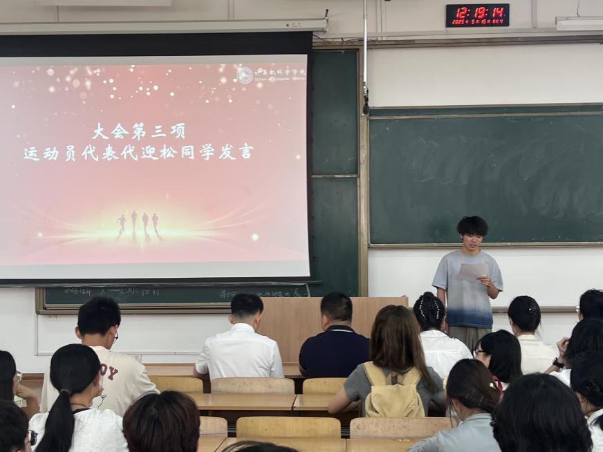 接下来,2024级运动员代表代迎松上台分享了他的体育故事。他讲述了自己在赛场上的拼搏经历和对体育的热爱,展现出一名青年运动达人顽强拼搏、追求卓越的精神风貌。