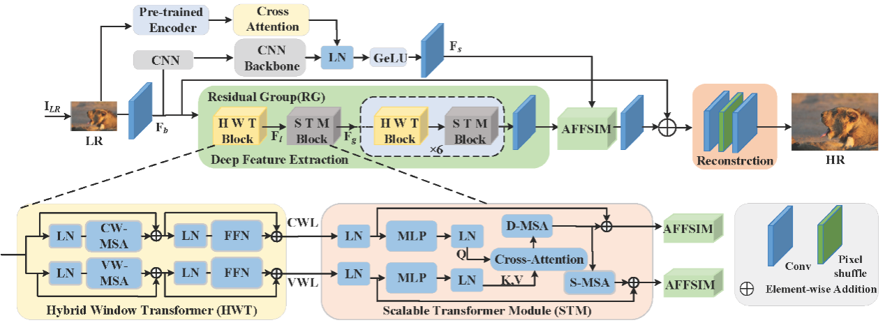 图像超分辨率(Image Super-Resolution, SR)是计算机视觉中的重要研究方向,旨在从低分辨率图像中重建出高质量的高清图像。近年来,基于Transformer的超分方法取得显著进展,但由于计算代价高昂,现有方法多局限于局部窗口注意力,难以有效建模长距离依赖和全局结构,导致重建图像在细节与整体一致性方面存在不足。针对这一问题,团队提出了一种全新的图像超分辨框架——语义驱动的全局-局部融合Transformer(SGLFT)。该方法通过混合窗口Transformer(HWT)与可扩展Transformer模块(STM)实现局部纹理与全局上下文的协同建模,并引入语义提取模块(SEM)提炼输入图像的高层语义先验,再结合自适应特征融合语义集成模块(AFFSIM)实现语义特征与视觉特征的高效融合。实验结果表明,SGLFT在多个标准数据集上均能有效生成更清晰自然、结构一致的高分辨率图像,性能显著优于现有方法。