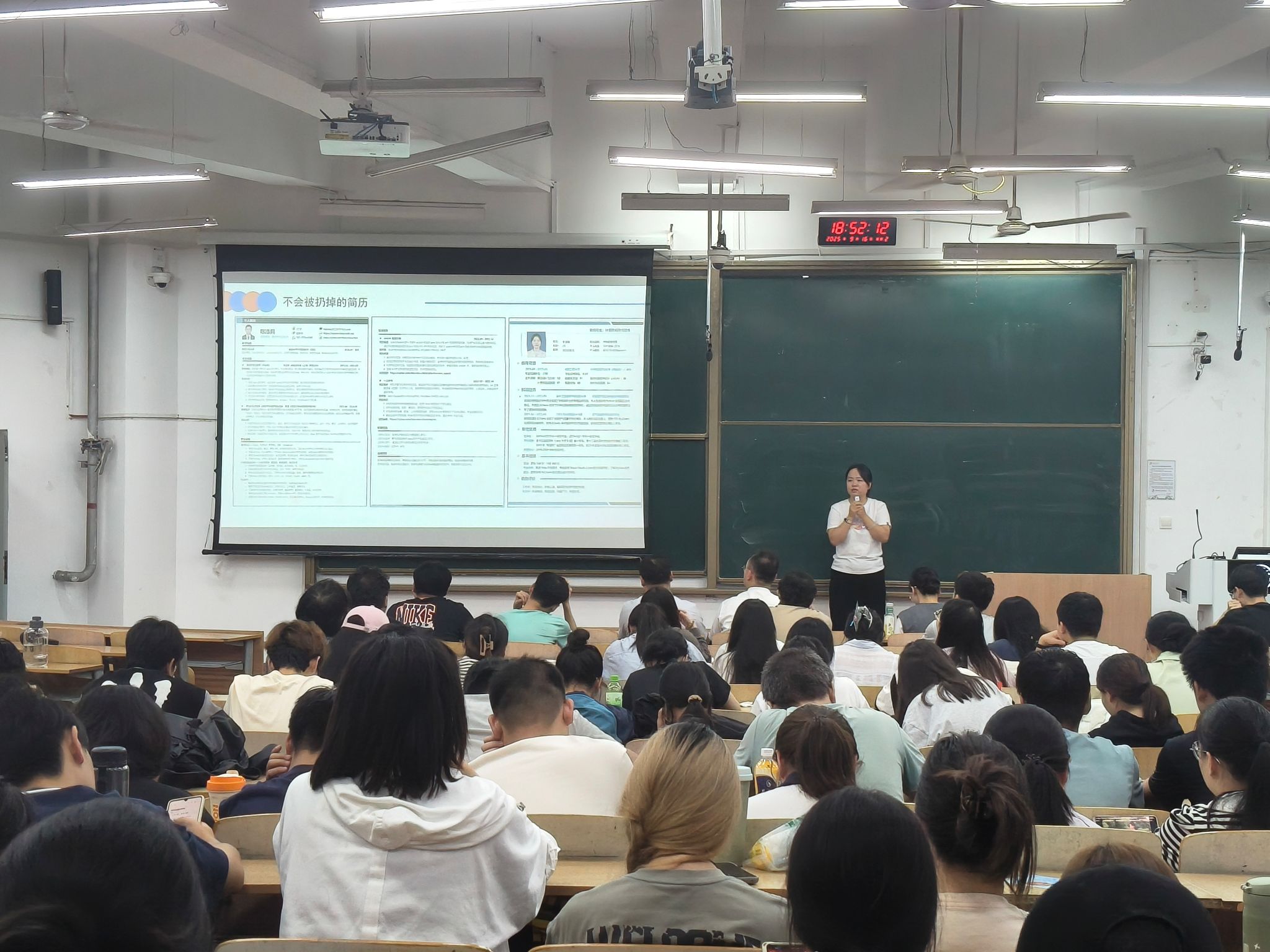 随后,左温慧结合往届毕业生就业典范案例,细致讲解简历各模块制作要点,进一步突出学生就业优势。她还全面介绍了近期学校与学院组织的招聘会及对接用人单位情况,鼓励学生主动投递简历、参与笔试面试,并公布了各专业就业咨询、简历诊断辅导员和联系方式,为学生咨询对接搭建便捷渠道。