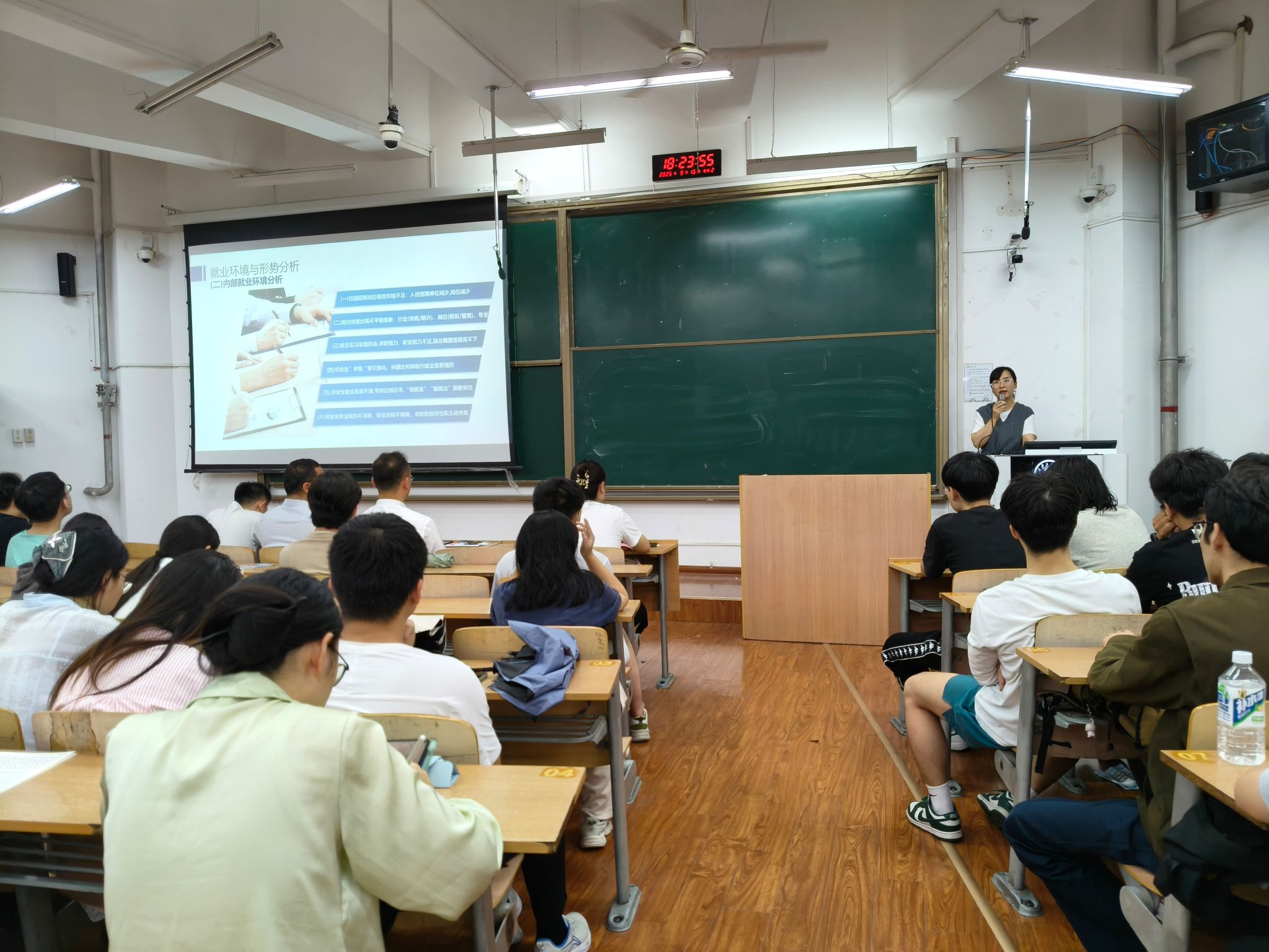 大会伊始,张苹通过详实数据,深度剖析就业市场供需变化、行业趋势、考公竞争态势与升学政策导向,并结合学生专业背景与求职意向,为毕业生精准锚定发展方向。同时,她详细介绍了学校和学院为保障就业推出的一系列举措,涵盖“网上签约”、免费打印协议、各类校园招聘活动、“一对一”帮扶及“竞赛”促就业等,全方位搭建支持体系,助力学生提升竞争力、自信迈向职场。