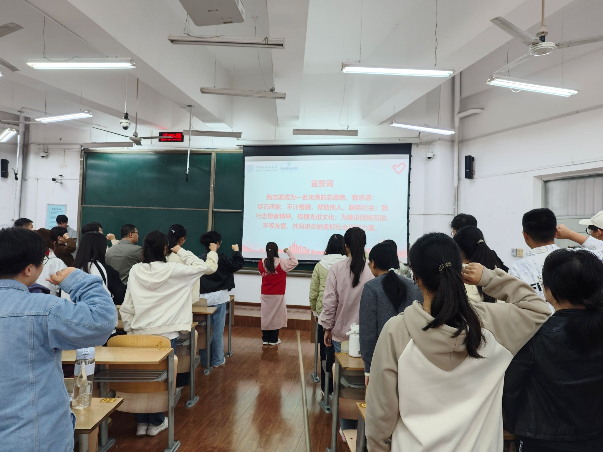 仪式在全体人员齐唱《青年志愿者之歌》的激昂旋律中拉开帷幕。计算机学院党委副书记赵勇进讲话。他充分肯定了过去一年中两学院志愿者在校园服务、社区共建、大型赛会等各类志愿服务活动中展现出的责任担当与奉献精神,深入阐释了志愿服务在锤炼青年品格、厚植家国情怀、推动社会进步中的重要意义。他对新加入的2025级青年志愿者表示热烈欢迎,希望他们以榜样为镜,传承志愿精神,在实践中增长才干,在服务中实现价值,让青春在奉献中绽放光彩。