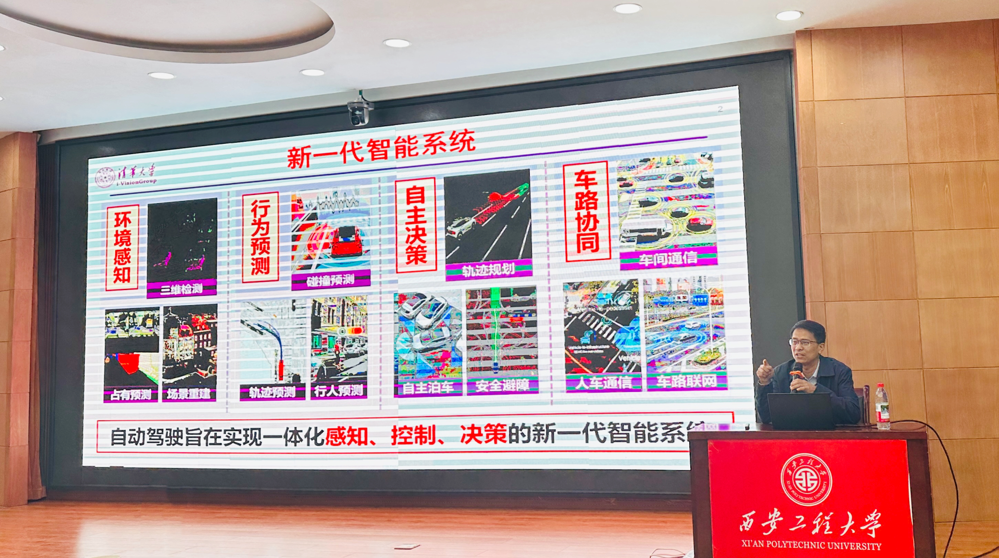 报告会开始前,张凯兵副院长致欢迎辞,并简要介绍了鲁继文教授在人工智能与计算机视觉领域的主要学术贡献。报告中,鲁继文教授系统梳理了近年来自动驾驶视觉感知的前沿研究进展,重点介绍了视觉场景生成、三维占据预测、端到端自动驾驶以及自动驾驶大模型等代表性技术,并深入分析了相关方法的优势、局限与应用潜力。最后,他对自动驾驶视觉感知未来的发展趋势进行了展望,为在场师生带来一场国际前沿、内容丰富、视野开阔的学术盛宴。
