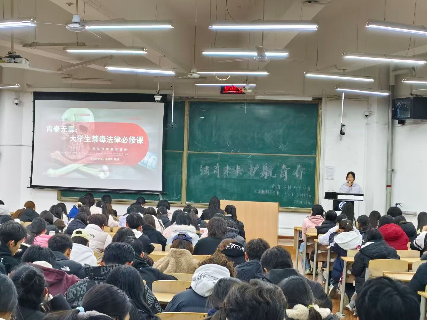 本次讲座创新采用“学生主讲、同龄人视角”模式,打破传统普法单向灌输的局限。8名法律协会的主讲学生在人文学院法学教师指导下,聚焦大学生高频法律风险场景,调研20余起高校典型案例、梳理百余篇法律法规条文,以鲜活表达和扎实储备开展宣讲。主讲学生围绕四大核心主题展开分享,精准覆盖校园法律风险点。“毒品危害与预防”板块,结合高校学子涉毒毁前程的真实案例解读《中华人民共和国禁毒法》,针对青年好奇心特点剖析危害,强化远离毒品的警示效果。“罪数形态”讲解中,融入计算机专业“代码思维”,以某高校学生出租银行卡帮诈并转走资金遭数罪并罚为例,用“代码流程图”拆解专业概念,强调“法律底线无撤销按钮”。“帮信罪防范”环节,通过大数据图谱揭示关键数据:近三年高校案件中82%涉“两卡出租”,90后占比超70%,“日结报酬”为主要诱饵。结合《中华人民共和国网络安全法》列出风险清单,演示账户自查方法并建议涉案者自首从宽。“知识产权保护”主题,以校园文创插画被商用案例解读《中华人民共和国著作权法》,提炼“固定证据——理性协商——依法投诉”维权三步法,分享成功获赔案例并建议及时进行著作权登记。