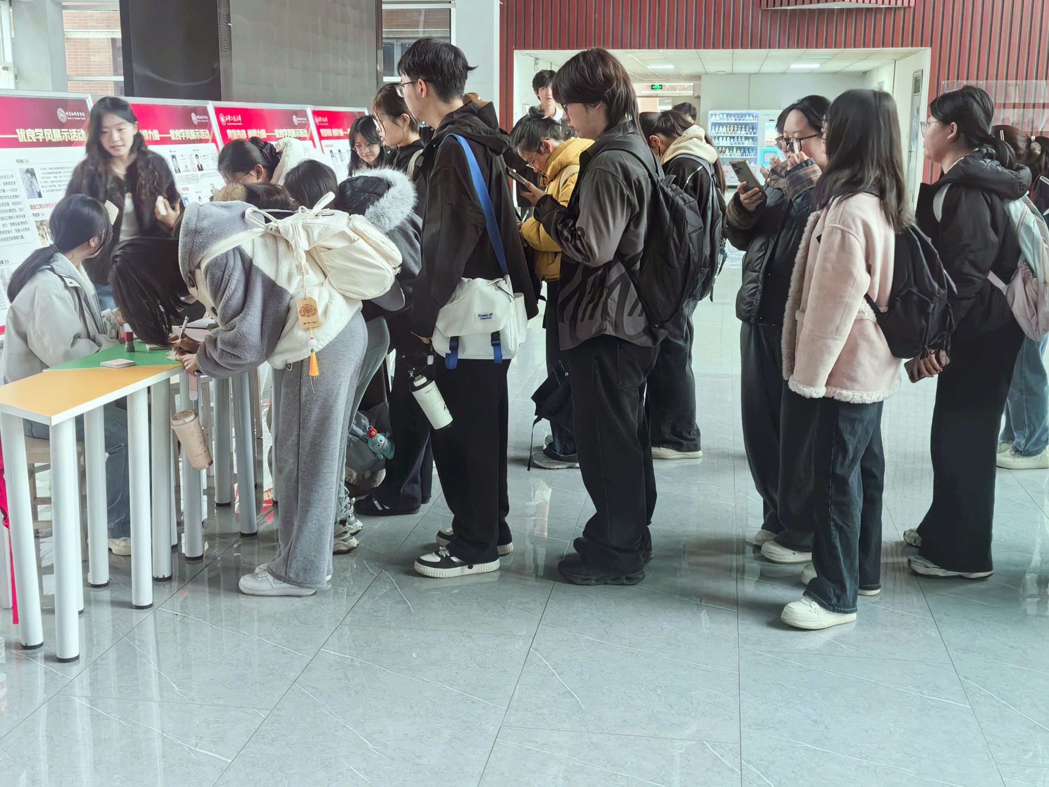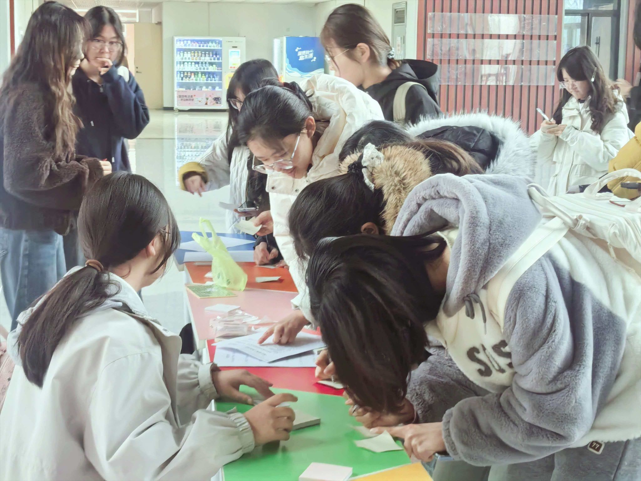 本次活动精心设置三大特色闯关环节,现场秩序井然、氛围热烈,学生参与热情高涨。消费维权知识答题环节率先拉开帷幕,同学们随机抽取消费维权、反诈骗相关题目独立作答,答对即可集章。大家认真思考、踊跃答题,在互动答题中系统学习消费维权法律知识与防骗技巧,进一步夯实消费安全认知基础。理性消费寄语书写环节为同学们搭建起理念表达与倡议传递的平台,大家在便利贴上认真写下理性消费标语、个人承诺与消费心得,并郑重粘贴于展示区,一张张寄语便利贴汇聚成校园里的正能量风景线,让理性消费理念在校园中不断传递蔓延。消费陷阱快速分辨环节紧扣校园日常与网络购物常见场景,以红绿贴纸标注方式辨别消费陷阱,同学们围桌讨论、仔细甄别,在趣味实践中提升风险识别能力,切实巩固消费安全知识。