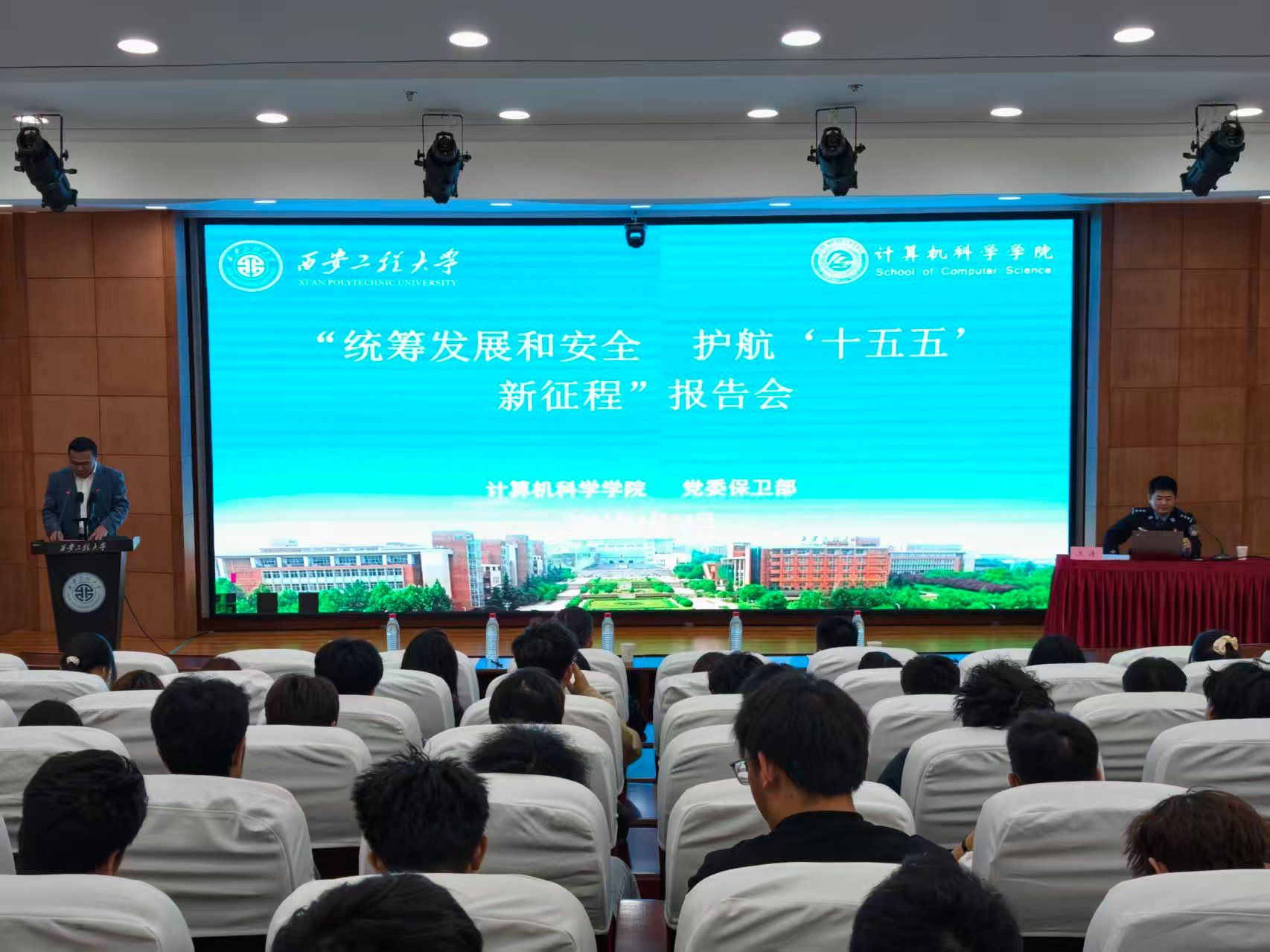 4月14日,9499www威尼斯和校党委保卫部联合主办“统筹发展和安全 护航‘十五五’新征程”第十一个全民国家安全教育日主题报告会。本次报告会特邀西安市公安局临潼分局政保大队和网安大队民警开展专题宣讲,3位民警和9499www威尼斯120余名师生代表参加报告会。会议由计算机学院党委副书记赵勇进主持。