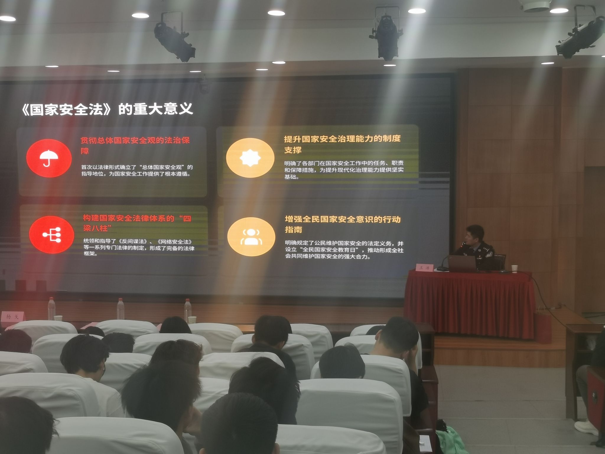 赵勇进对两位警官的精彩讲授表示衷心感谢。他指出,安全是发展的保障,在学院推进“十五五”规划任务的关键阶段,维护校园安全稳定意义重大。他要求学院师生立足专业、履行责任,将安全意识融入学习科研工作生活中,共同维护校园安全。他表示学院将持续联合校党委保卫部等部门深入开展国家安全教育日宣传,完善防控体系,为学院事业高质量发展和“十五五”开局筑牢安全保障。
