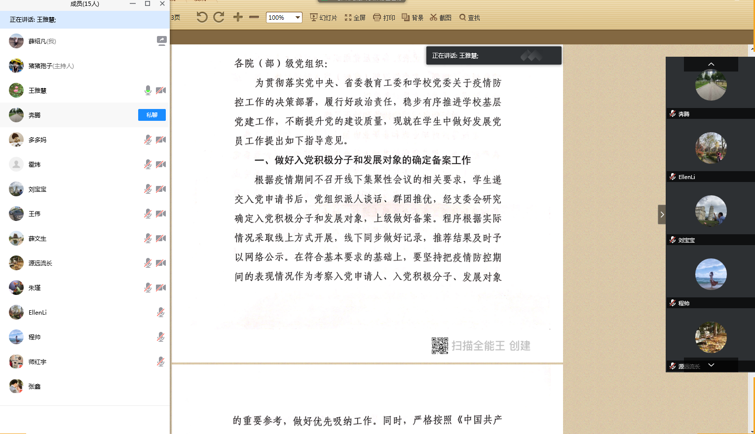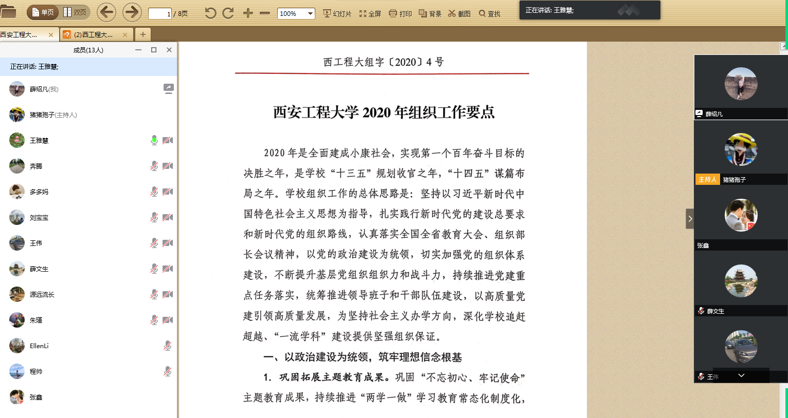会上,王雅慧首先传达了《威尼斯9499登录入口2020年组织工作要点》、《关于疫情防控期间在学生中做好发展党员工作的指导意见》等文件精神,并对以上文件进行了解读,对近期党建工作做了安排部署。之后与会成员认真学习了习近平总书记在陕西考察时的重要讲话精神,明确总书记提出的推动经济高质量发展迈出更大步伐、打造内陆改革开放高地、推动生态环境质量持续好转、加强民生保障和社会建设、推动全面从严治党向纵深发展等五项要求。王雅慧要求各党支部要组织党员认真学习习近平总书记在陕西考察时的重要讲话,深刻理解领会习近平总书记重要讲话重要指示的核心要义、精神实质并自觉用以武装头脑,切实推动工作。