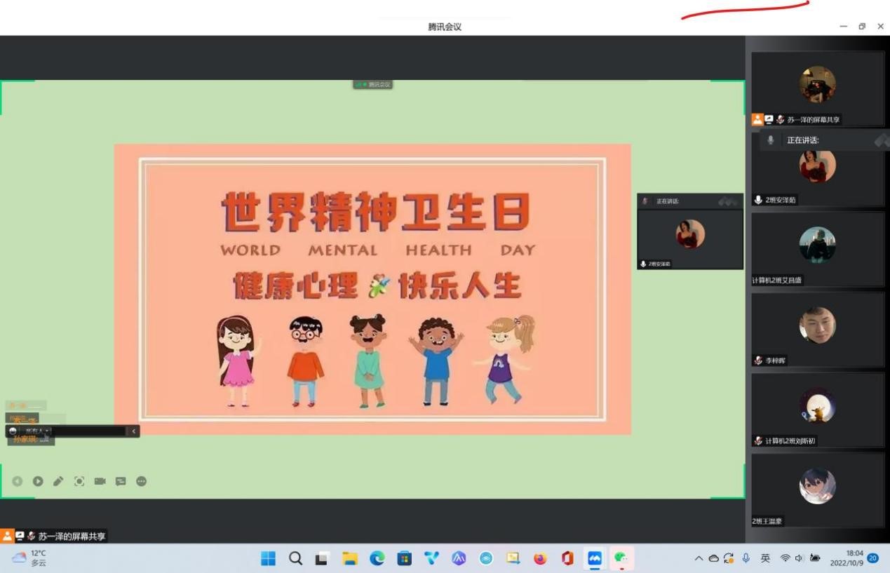 10月10日,9499www威尼斯各年级以班级为单位在线上以腾讯会议的形式组织开展了10.10“世界精神卫生日”心理健康主题班会,班会主要由各班前期受过校心理健康教育中心培训的心理委员主持,各年级班主任、辅导员和心理辅导员积极参会。