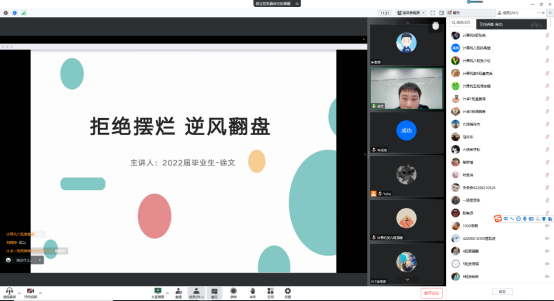 徐文为学生分享了他担任大学期间学习委员的求学和工作经验,告诫学弟学妹要在“思”、“真”、“做”三方面下功夫,不断学习、反思,以身作则,坚持秉持服务大家的初心和宗旨,并为此付出实际行动。此外他还讲解了英语学习的方法,他指出,大一是打好专业基础的关键时期,要全面锻炼听说读写的能力,可以大声练习口语,坚持模仿训练,抓住课堂机会,重视综合英语的学习,并积极与老师沟通。此外,他建议学生应踊跃参加与英语相关的比赛,进一步增强英语学习能力。