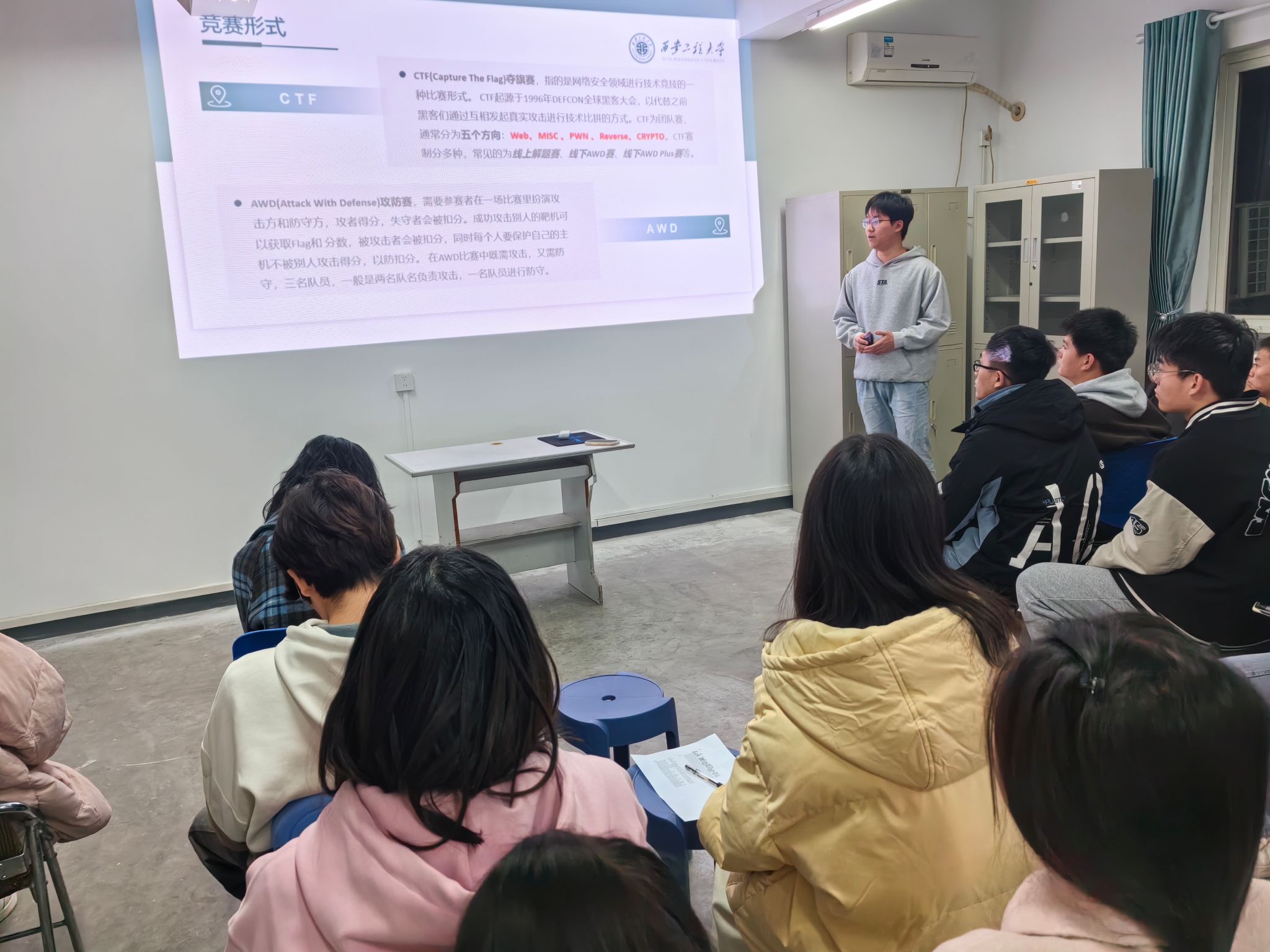 何浔航首先介绍了网络安全竞赛的重要性,详细阐述了CTF夺旗赛和AWD攻防赛的基本规则与特点,让同学们对这两种竞赛形式有了更深入的了解。随后,他向同学们推荐了包括“全国大学生信息安全竞赛”、“强网杯”、“蓝帽杯”和“网鼎杯”等在内的多项业内权威赛事,详细分析了各赛事的特色优势、赛制流程及参赛价值,帮助同学们明确各自的兴趣方向。在讲座中,他主要从Web、MISC(安全杂项)、PWM(二进制方向)、Reverse(逆向工程)和Crypto(密码学)等热门板块入手介绍了网络安全竞赛每个方向的基本内容,重点讲解了所需的技术栈及核心技能。在实战演练讲解环节,他选取了Web安全作为切入点,详细讲解了SQL注入原理及如何利用漏洞篡改数据库查询语句窃取数据的技巧,让同学们对网络安全知识的实战应用有了感性的认知。