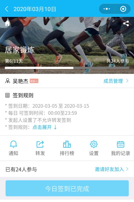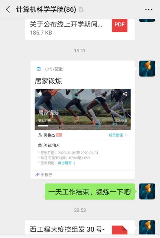 我们目前已经线上开学二周了,许多教师、行政人员每天居家办公、准备网课、在线教学、信息统计等等,花费大量时间面对电脑屏幕、手机,大多足不出户,锻炼身体就显得尤为重要了。在三八妇女节这个属于女同胞的节日里,学院女教职工们积极参加了居家锻炼活动打卡,相互鼓励,坚持锻炼。此次锻炼活动将持续一周,相信会有越来越多的老师加入健身的行列,让我们用积极的心态抗击疫情,用更加充沛的精力投入线上教学工作中,期待在不久的将来,在满园春色的校园里相聚!(撰稿:吴艳杰 审稿:王雅慧)